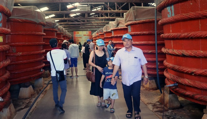 Khách du lịch tham quan khu sản xuất nước mắm tại Nhà thùng nước mắm Khải Hoàn trên đảo Phú Quốc (Kiên Giang). (Ảnh: Lê Huy Hải/ TTXVN)