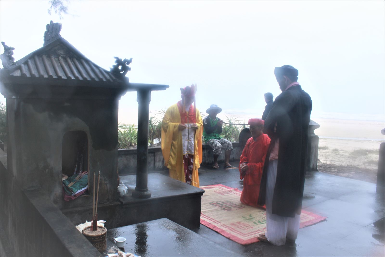 Hội chủ làng thực hiện nghi thức rước thần biển về an vị tại miếu làng Trung An (Ảnh Ngọc Thiệp)