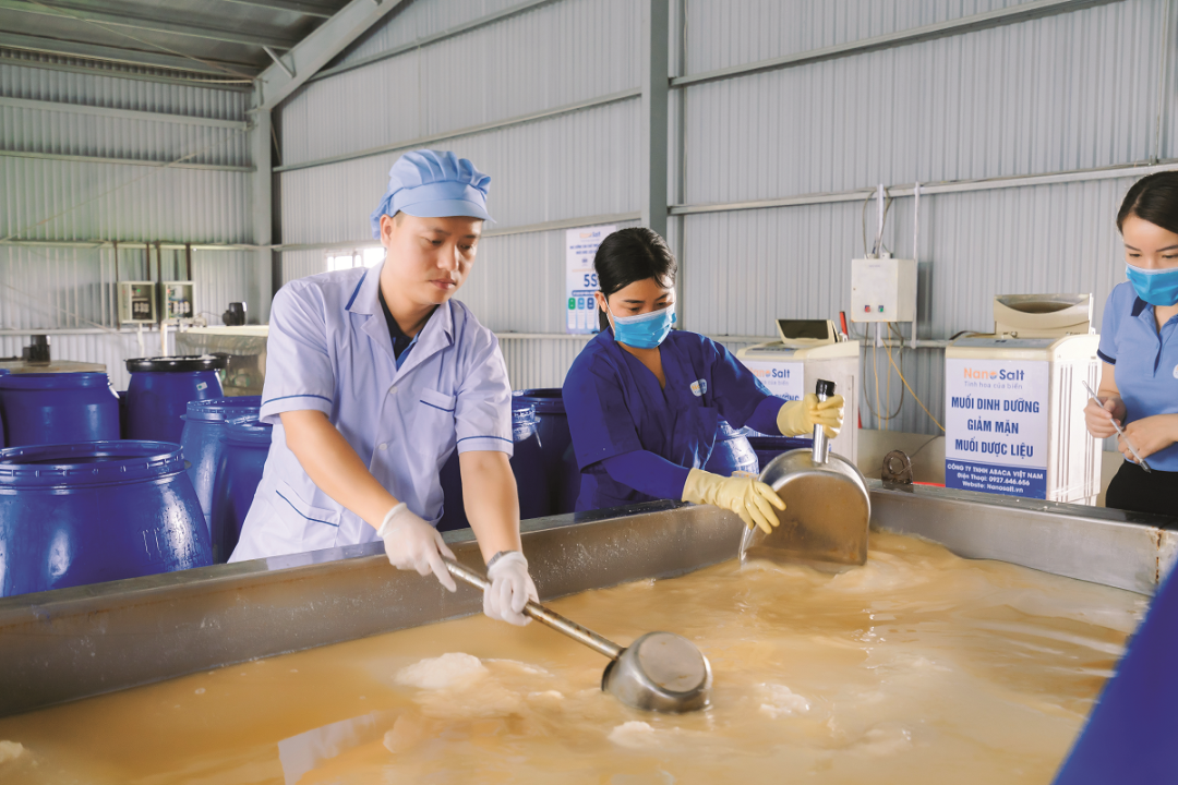Vinh nói, trong mật muối có chứa khoáng Natri, Kali, Magie và 60 vi khoáng khác. Sau khi gom muối lẫn mật muối của bà con từ các hợp tác xã, Abaca Việt Nam đi qua ba sáng chế công nghệ để phân tách ra các dòng muối khác nhau: muối gia vị (muối giảm mặn, bột canh giảm mặn, muối tôm, muối chua cay, muối không i-ốt), muối dược liệu (muối ngâm chân, muối tắm cho bé, muối epsom (spa/ massage/ rửa mặt/ tẩy tế bào chết). Abaca Việt Nam vẫn đang tiếp tục nghiên cứu cho ra những sản phẩm mới. Lúc tôi đến xưởng sản xuất, Vinh khoe vừa thử nghiệm thành công mẫu muối nhuộm màu phong thủy, ngũ hành mới, có chứa tinh dầu.
