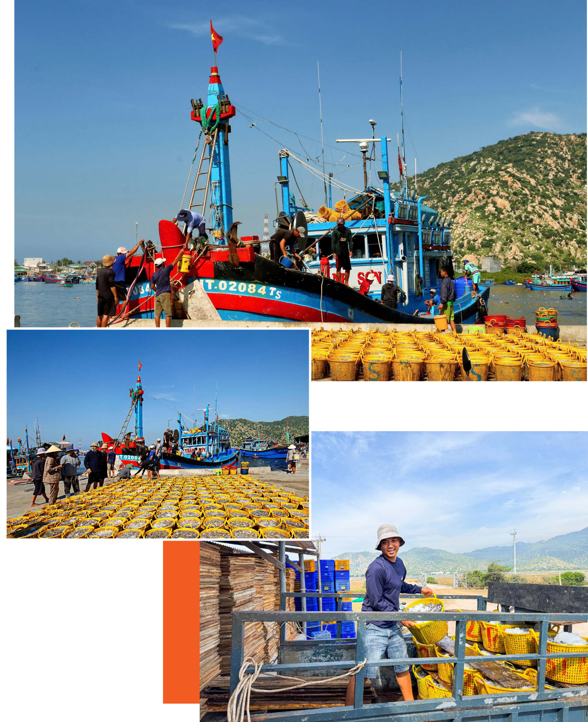 Trong nắng sớm, đến thăm làng biển xã Cà Ná, chúng tôi bắt gặp hình ảnh những vỉ cá cơm được phơi ngay ngắn dọc hai bên đường tạo nên bức tranh sống động mang đậm sắc màu của làng biển duyên hải Nam Trung Bộ. Theo ngư dân nơi đây, mùa cá cơm tập trung từ tháng 5 đến tháng 9, với từng chuyến thuyền đầy ắp cá cập cảng, đưa về các lò hấp đỏ lửa suốt ngày đêm.