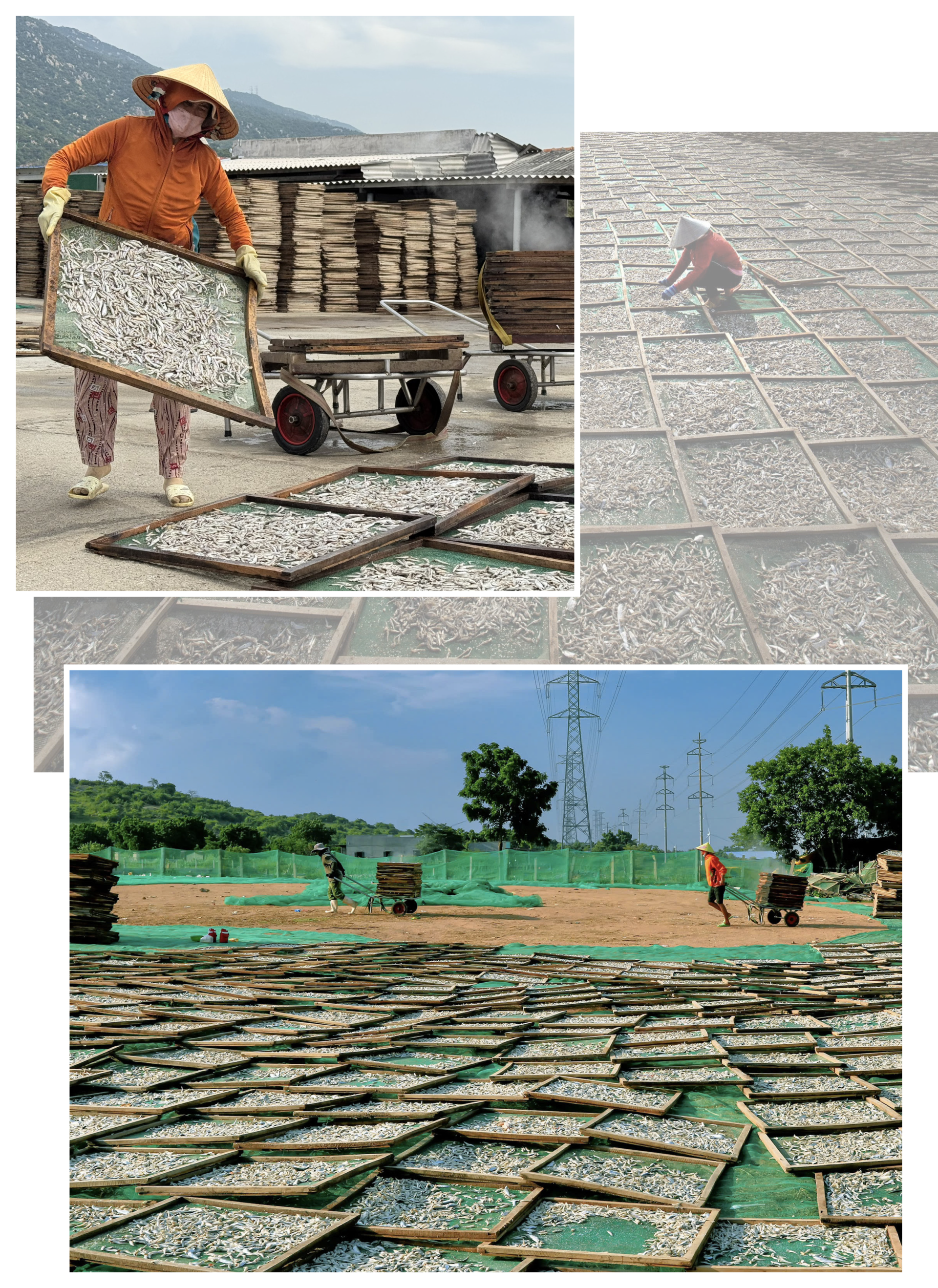 Từ cảng cá, từng giỏ cá cơm tươi rói được khuân vác lên xe, đưa thẳng đến các nhà lò. Cá cơm được sơ chế bằng nước ngọt, ướp muối vừa đủ để giữ độ tươi, rồi xếp ngay ngắn lên vỉ. Mỗi vỉ được đưa vào lò hấp trong 10 – 15 phút để cá chín tới, giữ nguyên màu sắc và mùi vị đặc trưng. Tiếp đó, cá được đưa ra sân phơi, đón nắng và gió biển 3 – 5 giờ cho đến khi khô giòn, thơm nức.