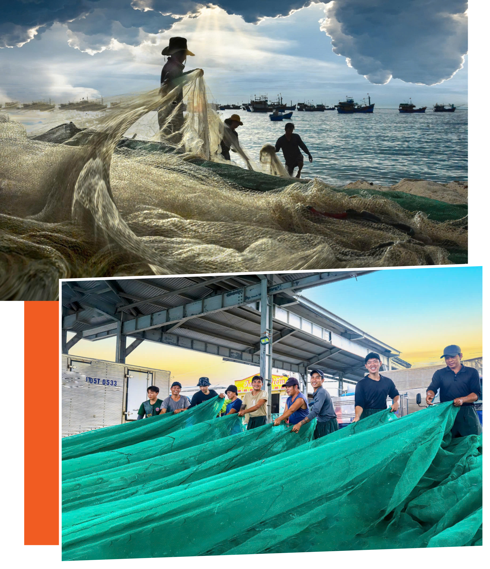Ngư dân xã Cà Ná chuẩn bị lưới ra khơi đánh bắt cá.