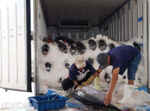 Cá ngừ đại dương sau sơ chế được ướp đá lạnh từ bên trong lẫn bên ngoài trên các xe đông lạnh để vận chuyển đến các tỉnh thành.