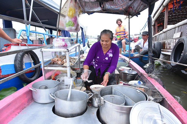Bà Bé năm nay 65 tuổi, tóc đã bạc, mặt nhiều nếp nhăn, da đen bóng khi cả đời gắn với sông nước, lênh đênh theo chợ nổi. Chiếc ghe bán bún của bà Bé nhỏ xíu, neo phía cuối chợ nổi Cái Răng, vị trí để khách sau khi đã tham quan hết chợ nổi có thể ghé lại thảnh thơi ăn sáng ngay trên sông.