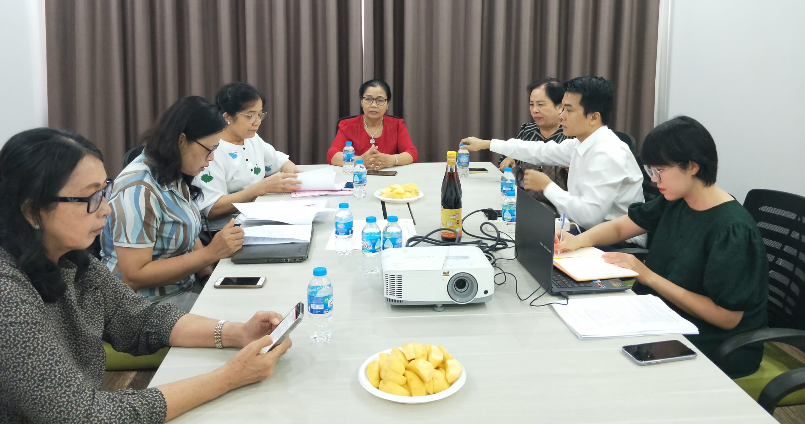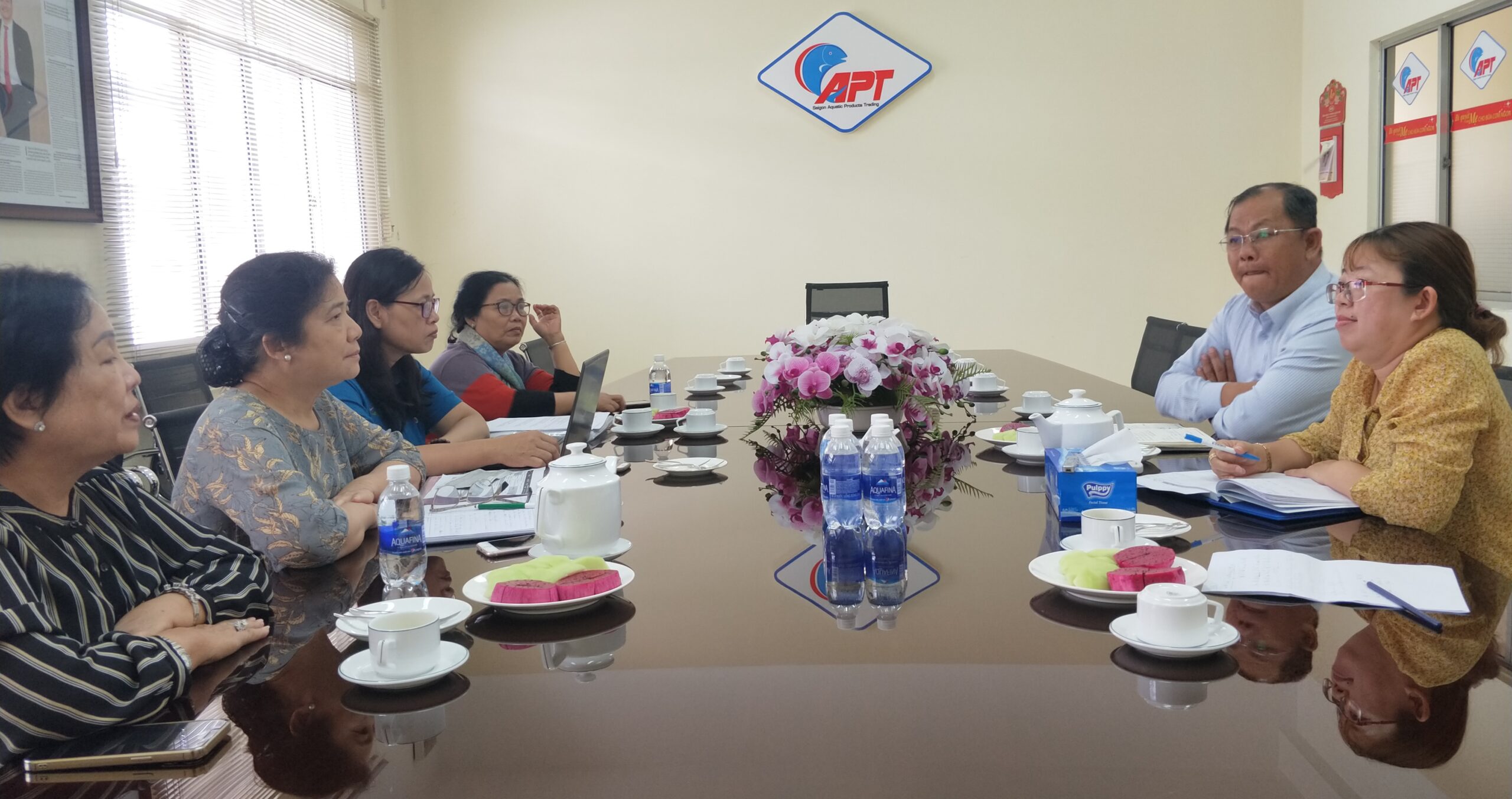 Phó tổng giám đốc Mai Minh Vương (thứ hai bên phải) và Giám đốc sản xuất Hồng Tố Linh (ngoài cùng bên phải) của Công ty CP Kinh doanh Thủy hải sản Sài Gòn (APT) cho biết, tuy nước mắm truyền thống chỉ chiếm một phần nhỏ trong doanh thu của công ty nhưng việc tiêu thụ sản phẩm hiện đang gặp nhiều khó khăn, chủ yếu bán trong hệ thống cửa hàng của công ty mẹ là Tổng công ty Thương mại Sài Gòn (SATRA). Tuy nhiên, trong buổi làm việc với đoàn công tác, công ty đã tìm được cơ hội liên kết với một số cơ sở sản xuất nước mắm ở Phú Quốc.Ông Trần Hữu Hiền (thứ hai bên phải), Giám đốc Công ty TNHH SX TM DV Bảy Hồng Hạnh, trao đổi với đoàn công tác về tình hình sản xuất kinh doanh của công ty, cũng như khả năng phối hợp với các hội viên khác để triển khai các chương trình thúc đẩy bán hàng trong thời gian tới.Tại văn phòng Công ty TNHH SX TM DV Minh Hà, đoàn công tác vui mừng gặp lại bà Nguyễn Thị Nguyệt Hà (thứ hai bên phải) là người sáng lập thương hiệu nước mắm Thanh Hà. Ngoài nước mắm và các sản phẩm nước chấm pha sẵn với các loại gia vị tỏi, ớt,… công ty còn kinh doanh nhiều mặt hàng nông sản khác như bánh tráng, hồ tiêu, trà,… Giám đốc công ty Ong Thị Kim Ngân (thứ ba bên trái) cho biết, công ty chủ yếu bán hàng vào các hệ thống siêu thị nên yêu cầu ngày càng cao của các hệ thống siêu thị khiến công ty gặp nhiều khó khăn. Tuy nhiên, giá xuất khẩu của công ty sang các thị trường nước ngoài như châu Âu và Nhật Bản vẫn khá ổn định.
