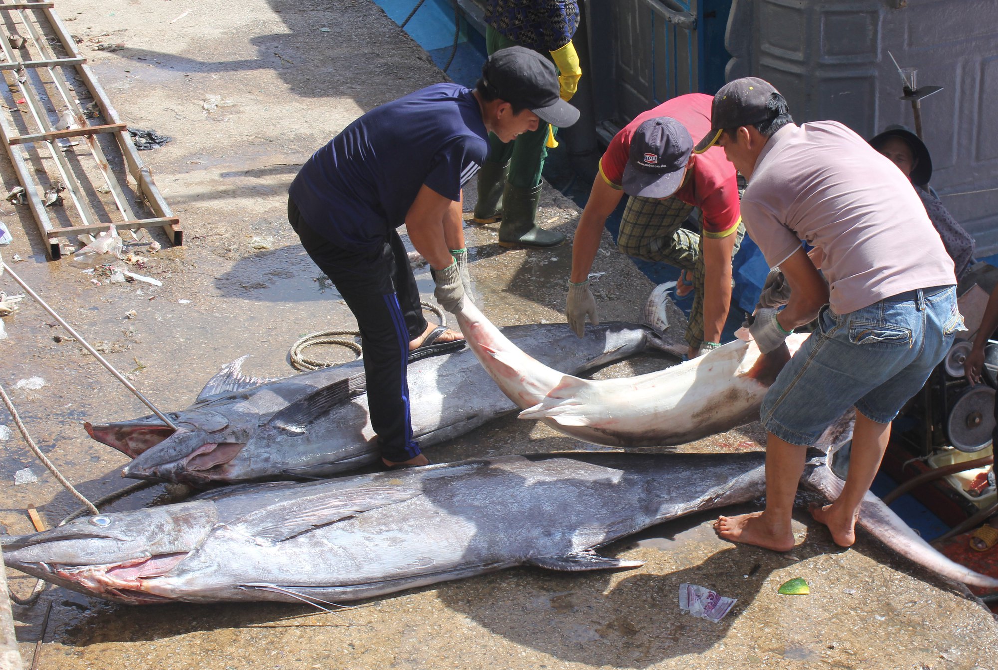 Những con cá cờ to phải nhờ đến 5 người khiêng và khi cân phải dùng 2 chiếc cân. Cá thu nhồng mỗi con vài chục ký lô và nhiều nhất vẫn là cá ngừ sọc dưa, cá ngừ chù. Sau khi cá được chuyển lên bờ, thương lái cân ngay rồi xếp vào sọt, đổ đá dăm và chuyển lên xe đông lạnh để chở đi muôn nơi.