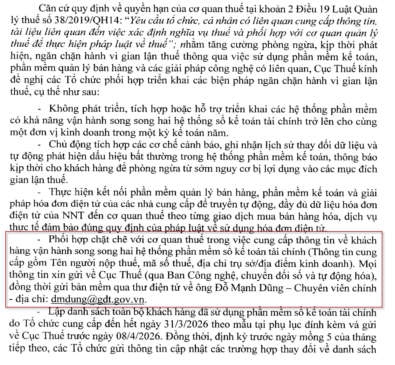 Theo chỉ đạo mới nhất, các nhà cung cấp phần mềm buộc phải chấm dứt ngay việc phát triển, cung cấp, tích hợp hoặc hỗ trợ triển khai các chức năng cho phép khách hàng chạy song song hai hệ thống sổ kế toán trong cùng một kỳ báo cáo. Hơn thế nữa, hệ thống phần mềm bắt buộc phải được thiết lập cơ chế ghi nhận lịch sử thay đổi dữ liệu , từ đó tự động phát hiện và phát đi cảnh báo sớm đối với các dấu hiệu gian lận thuế.