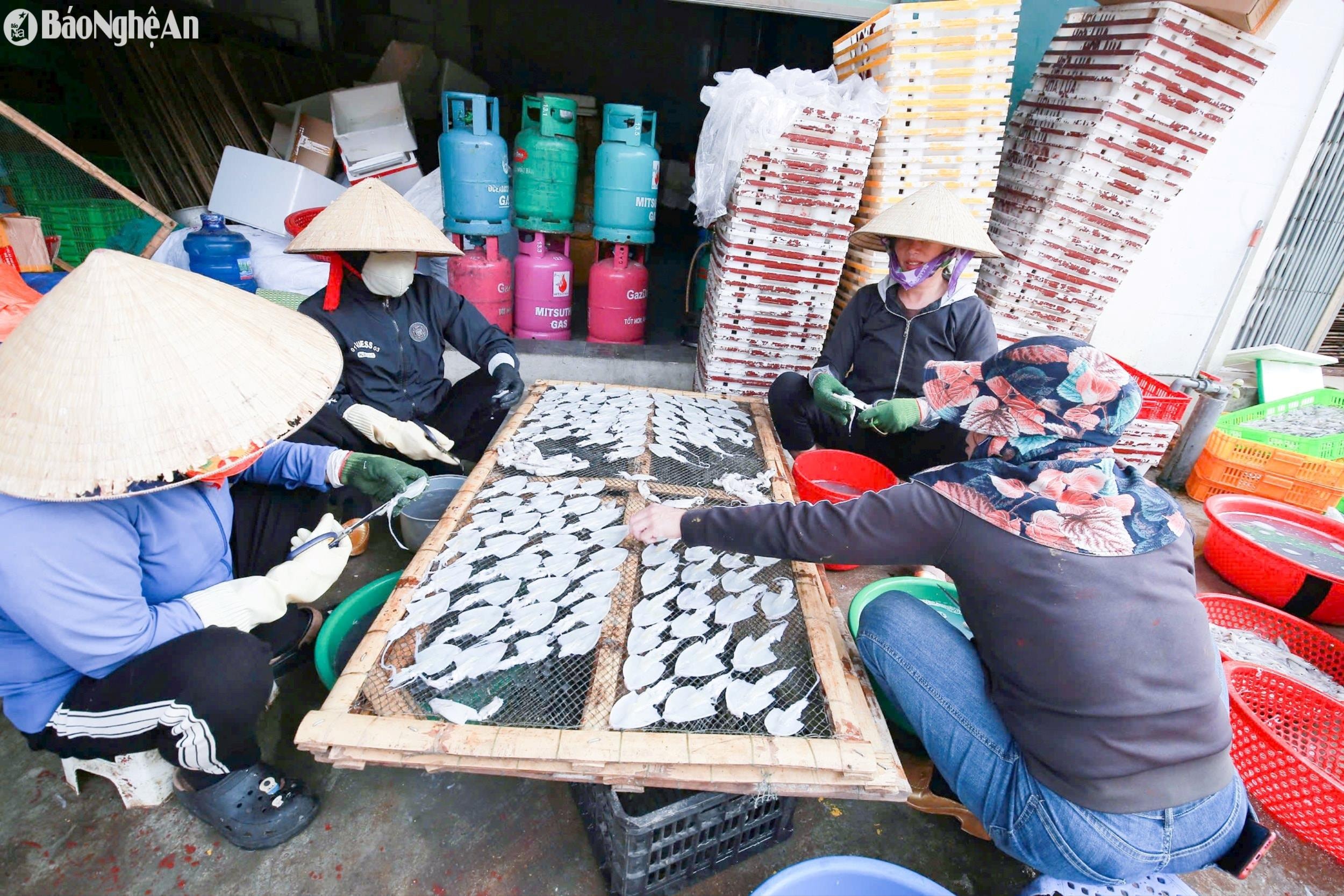 Sau chuyến vươn khơi, hàng loạt tàu cá của ngư dân Nghệ An cập bến với khoang đầy tôm, cá, đặc biệt là mực. Ảnh: T.PMực được vận chuyển lên bờ, thương lái chen chân thu mua ngay tại cảng để kịp cung ứng cho các nhà hàng, chợ đầu mối. Ảnh: T.PMực sim luộc, mực ống… đang là mặt hàng được ưa chuộng đầu mùa du lịch, giá bán dao động từ 150.000 đến 250.000 đồng/kg. Ảnh: T.PBí quyết giúp giữ được độ tươi, giòn, ngọt cho mực được ngư dân truyền từ đời này sang đời khác là luộc mực ngay trên tàu sau mỗi mẻ lưới. Nhờ đó, giá bán cũng cao hơn, được thương lái ưa chuộng hơn. Ảnh: T.P Mực ống, mực lá được sơ chế và cấp đông tại chỗ để giữ chất lượng tốt nhất trước khi phân phối ra thị trường. Ảnh: T.P Trong đó, mực một nắng, mực khô – những đặc sản biển của Nghệ An được phơi ngay sau khi sơ chế, trở thành món quà được du khách ưa chuộng. Ảnh: T.P Mực tươi sau khi sơ chế được đưa vào cấp đông nhằm đảm bảo chất lượng khi vận chuyển xa. Các cơ sở chế biến tại Nghệ An hiện được linh hoạt đóng gói, bảo quản theo yêu cầu của khách du lịch. Ảnh: T.P Đặc biệt, ở Cửa Lò (TP.Vinh) với đặc thù câu mực đêm, đánh bắt gần bờ nên ngư dân tìm cách nuôi sống mực trong khoang thuyền. Những con mực về đến bờ đang bơi, khi bắt lên bán vẫn còn tươi sống, bật tanh tách, mắt và những đốm trên thân ánh lên những mảng màu lấp lánh nên được gọi là “mực nhảy” hay “mực nháy”. Giá bán lên đến 350.000 – 500.000 đồng/kg. Ảnh: T.P Đầu mùa du lịch, ngư dân trúng đậm mực, giá bán cao nên ai cũng phấn khởi. Ngư dân Nguyễn Văn Sơn, chủ một tàu cá ở phường Quỳnh Phương cho biết: “Sau 5 ngày ra khơi, thuyền trúng 4 tấn mực cùng các loại cá hố, cá thu, cá trỏng. Trừ chi phí, mỗi thủy thủ có thu nhập 6 triệu đồng”. Ảnh: T.P Từ những mẻ mực tươi rói ngoài khơi đến khay hàng cấp đông sẵn sàng theo chân du khách, mỗi công đoạn đều ghi dấu bàn tay cần cù, khéo léo của người dân vùng biển. Những nụ cười rạng rỡ sau chuyến biển “trúng đậm” là minh chứng sống động cho một mùa biển bội thu, đầy hy vọng. Ảnh: T.P