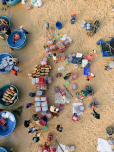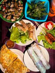 Những quán ăn vặt ở làng chài “siêu rẻ”. Hòa ngỡ ngàng khi bánh xèo chỉ 3.000-5.000 đồng/cái, to ú ụ, các món bún, bánh mì thì với 10.000-15.000 đồng đủ ăn no. “Buổi tối mình sẽ ra bãi biển ăn vặt. Với 50.000 đồng là có bàn đồ ăn đầy ắp. Món ăn đơn giản thôi nhưng ngon miệng, được hưởng gió mát lạnh, ngắm mặt biển bao la”, Hòa kể.