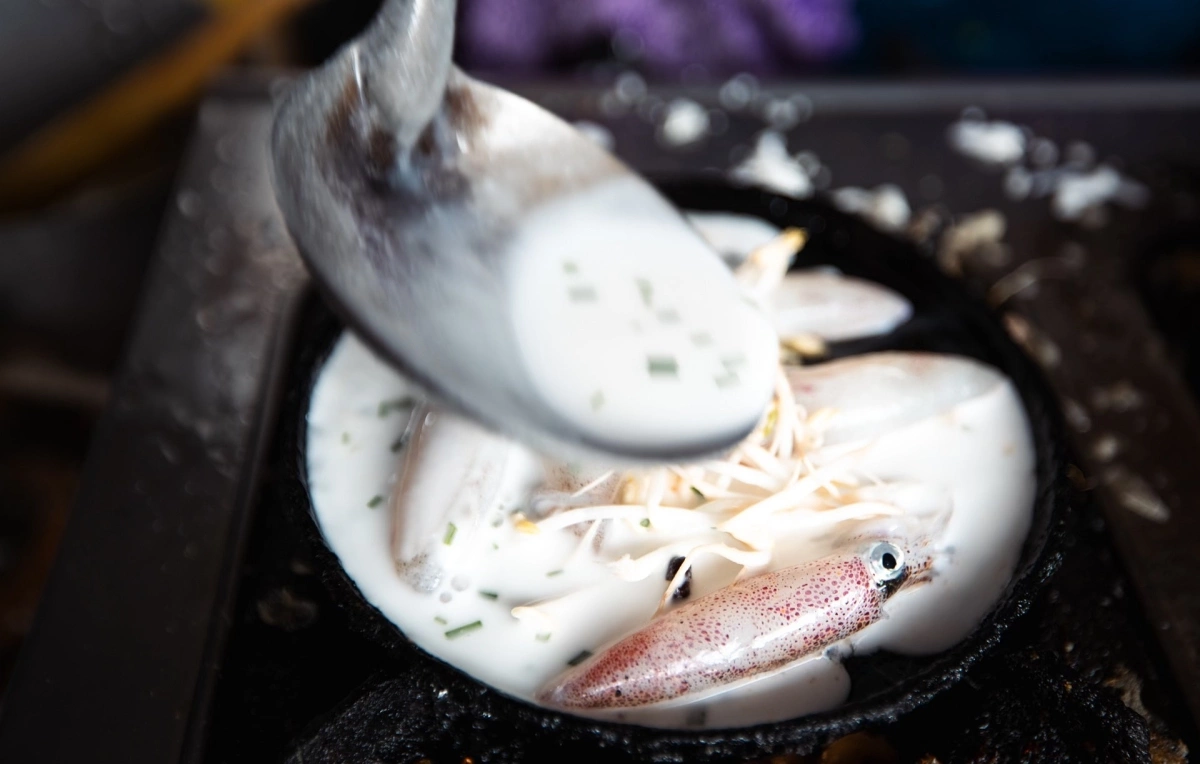 Du khách có thể mua mực từ những tàu cá mới về rồi đem tới hàng bánh xèo trong làng để đúc, chi phí chỉ 2.000 đồng tiền công.