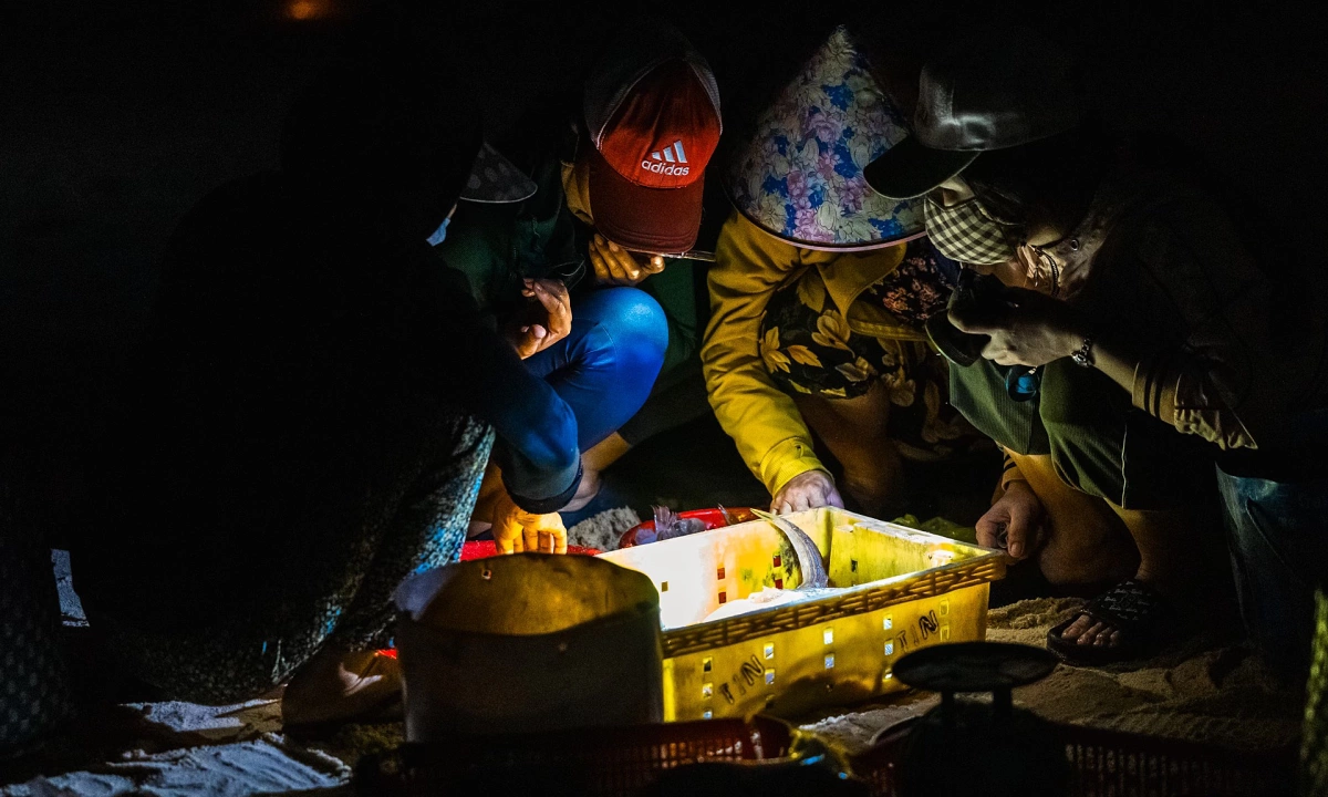Phiên chợ ở làng chài An Hải bắt đầu từ 3h đến khoảng 7h. Bãi biển An Hải tối đen bỗng trở nên sống động với ánh sáng rực rỡ từ những chiếc đèn xanh, đỏ nhấp nháy trên thuyền, hòa quyện cùng ánh đèn vàng, trắng từ những chiếc đèn đội đầu của ngư dân đang gỡ lưới.