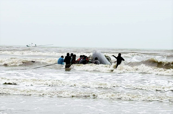 Đang trên đường vào bờ sau khi trúng đậm mẻ cá trích, một thuyền đánh cá ở Hà Tĩnh bị sóng đánh lật úp. Người dân nhanh chóng huy động xe kéo ứng cứu.