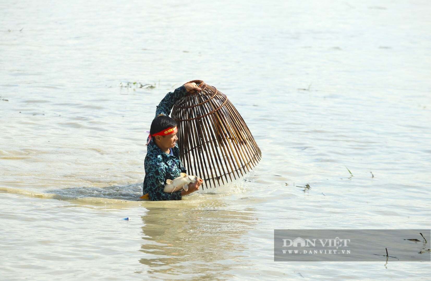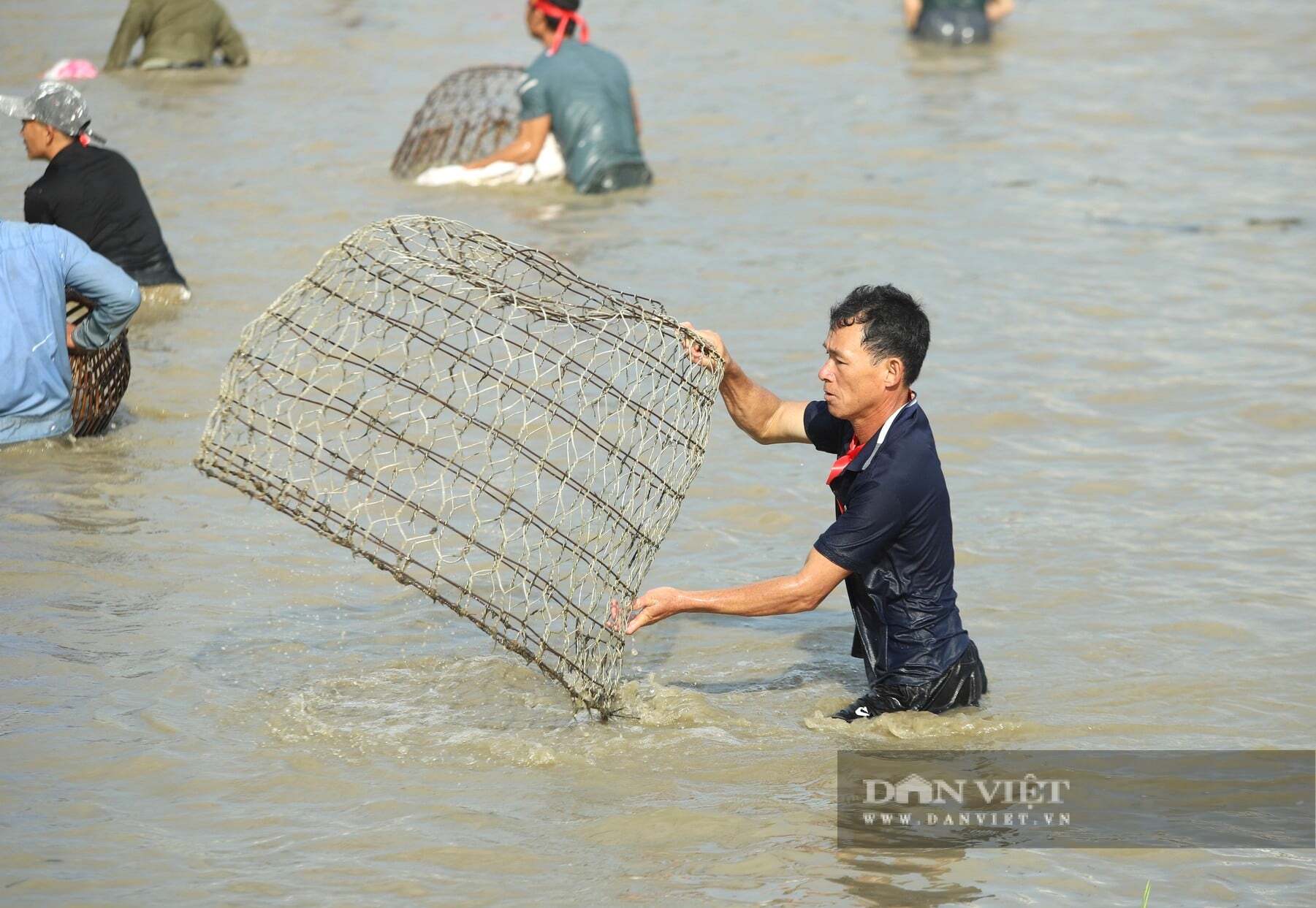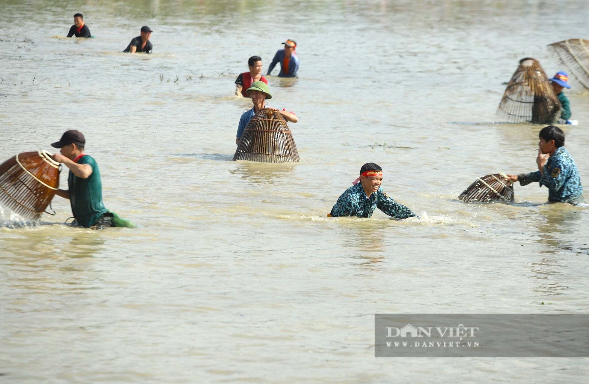 Những “nơm thủ” lội dưới làn nước hy vọng đánh trúng những con cá to, bự nhất. Ảnh: Rạng Đông