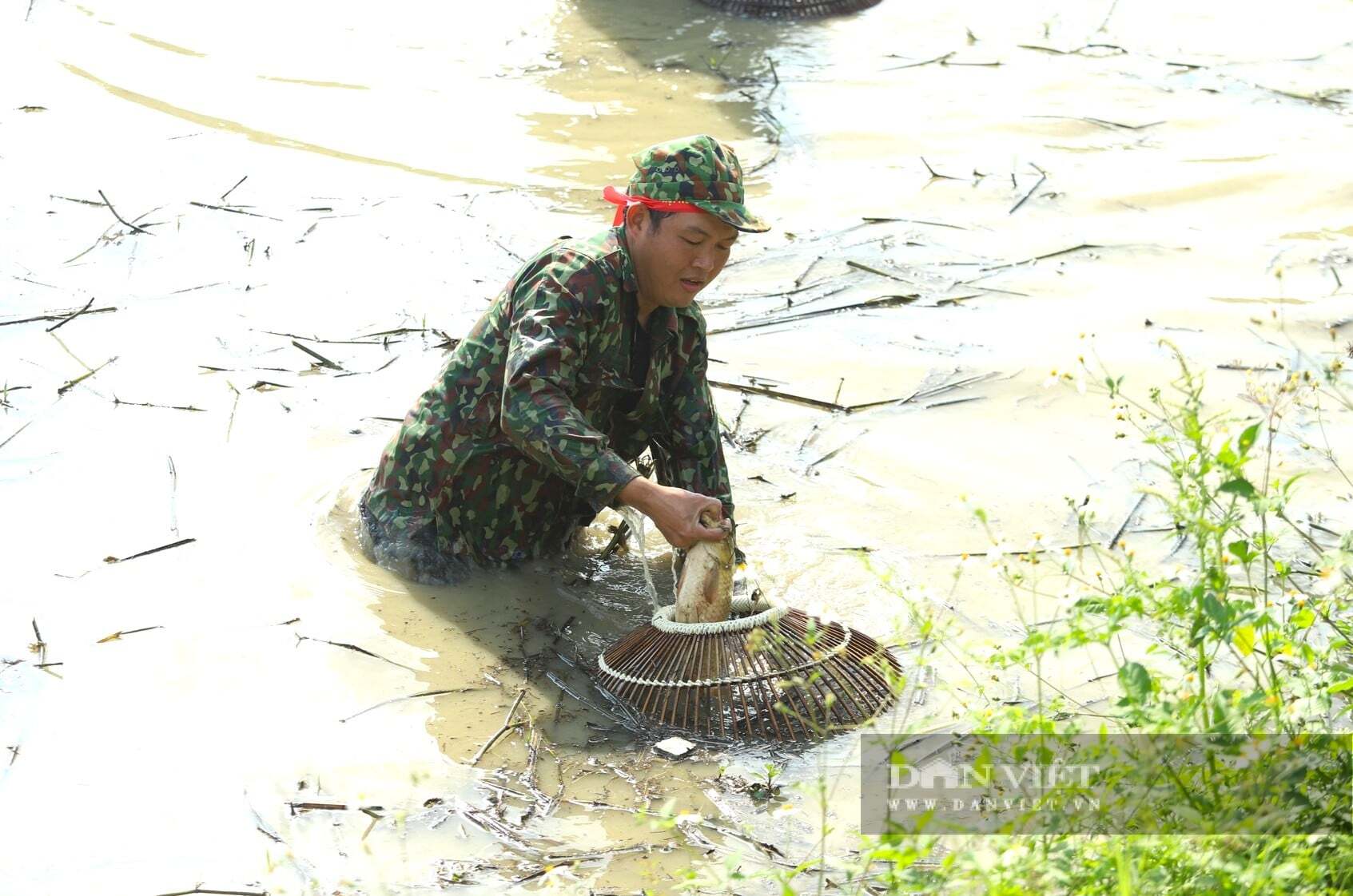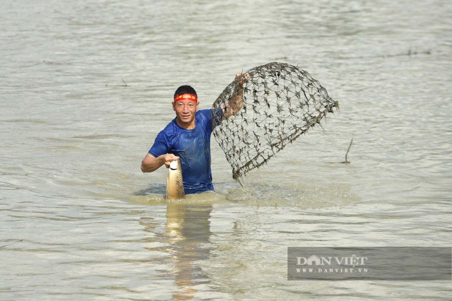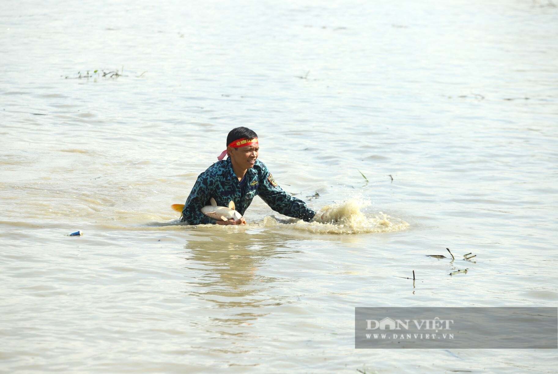 Những “nơm thủ” lội dưới làn nước hy vọng đánh trúng những con cá to, bự nhất. Ảnh: Rạng Đông
