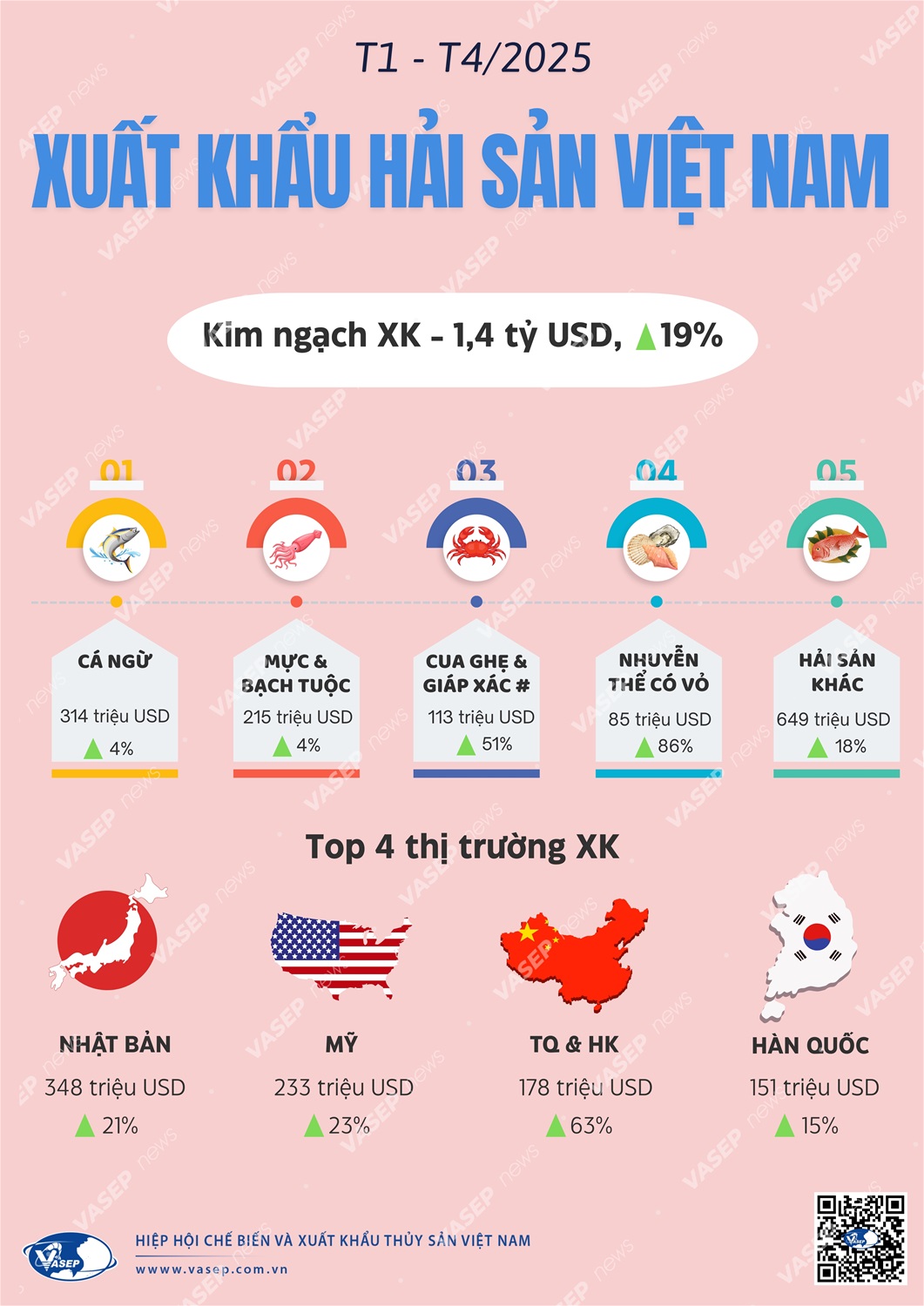 Infographic: Xuất khẩu hải sản của Việt Nam 4 tháng đầu năm 2025 Đăng lúc 27/05/2025 Bởi quản lý Tháng 4/2025, XK hải sản của Việt Nam tiếp tục tăng trưởng, tuy nhiên tốc độ tăng trưởng có xu hướng chậm lại. Tính luỹ kế 4 tháng đầu năm 2025, XK hải sản của Việt Nam đạt 1,4 tỷ USD, tăng 19% so với cùng kỳ. Nguyễn Hà VASEP