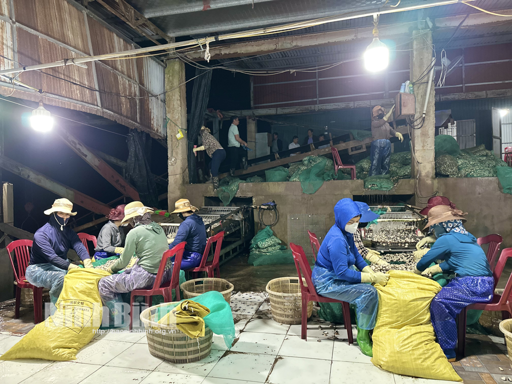 Chúng tôi về Kim Sơn vào một buổi đêm giữa tháng 4, chạy xe dọc tuyến đê Bình Minh III, có tới gần chục điểm tập kết, sơ chế ngao, tất cả đều thắp điện sáng trưng hoạt động tấp nập, xuyên đêm. Các tàu ngao sau một ngày dài thu hoạch trên biển giờ đây cập bến với hàng trăm, hàng nghìn bì ngao trắng tinh xếp đều tăm tắp trên boong. Các bì ngao này được chuyển lên bờ bằng hệ thống băng chuyền rồi nhanh chóng đưa vào dây chuyền sàng, phân loại, rửa và đóng gói. Ngoài bãi, hàng chục xe tải, xe container đông lạnh của các công ty thu mua cũng tập kết sẵn sàng chở ngao về nhà máy chế biến, đóng gói hoặc đưa đi tiêu thụ tươi.