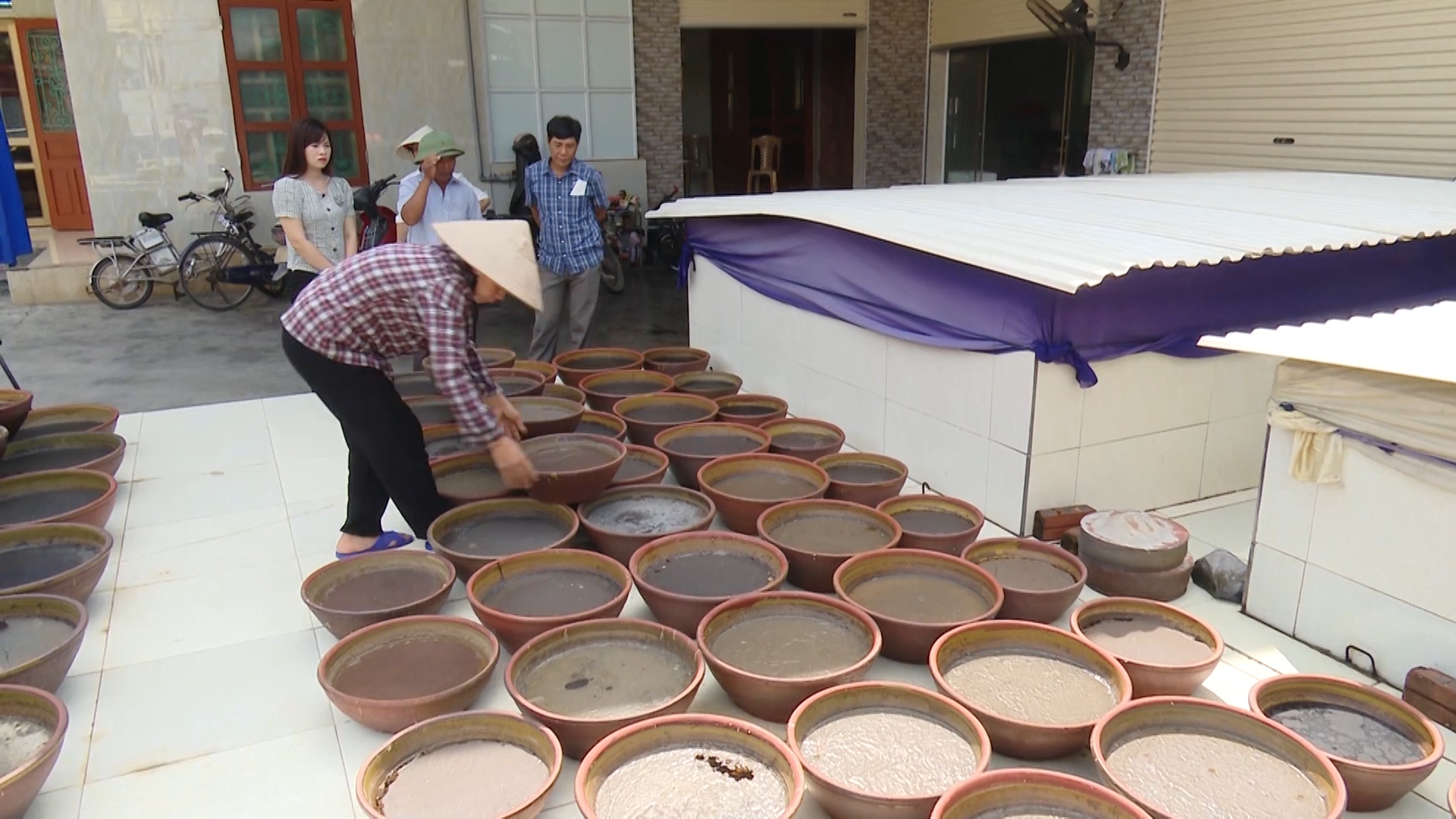 Chị Bùi Thị Tuyết, thôn Nội Lang Nam, xã Nam Hải, huyện Tiền Hải: “Thường thì gia đình sẽ phơi những chậu nước mắm khoảng từ nửa đến 1 tháng mới xong. Vì tùy theo nắng và chỉ lấy khoảng 1 nửa nước cốt ở chậu sành thôi.”