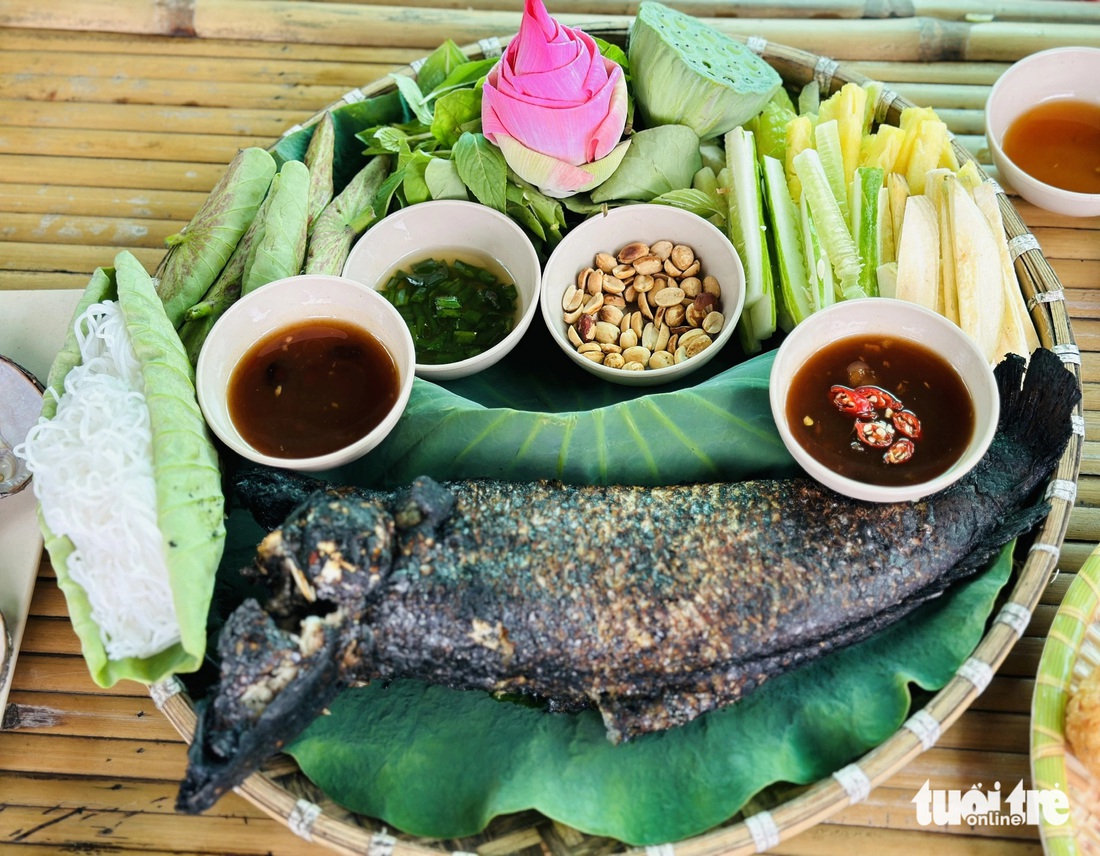 Cá lóc nướng trui cuốn lá sen non – Ảnh: ĐẶNG TUYẾT