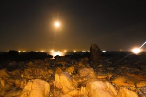 Ban đêm, trăng lên, gió lặng, sóng dịu êm hơn. Ánh trăng soi xuống mặt biển lấp lánh, khiến khung cảnh càng đẹp mắt và bình yên. “Chúng tôi ăn no nê, ngắm biển rồi ngủ ngon lành trong lều. Thời tiết mát lạnh, tiếng sóng vỗ rì rào”, anh Tường nói.