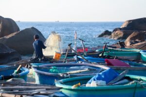 Làng chài hiện ra trước mắt với vài hộ dân sống ven biển, vài chục chiếc thuyền thúng. Mặt trước là biển cả mênh mông, sau lưng là dãy đồi thấp rộng lớn bao bọc. “Không gian yên ắng lạ thường. Không có khách du lịch nào ở đây”, anh Tường nói.