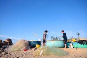 Buổi sáng, nhóm thức dậy sớm đón ánh bình minh và ngắm nhìn người dân làng chài đưa thuyền thúng vào bờ, gỡ mẻ lưới nhanh cho kịp buổi chợ sớm. Khi mặt trời bắt đầu lên cao, nắng ấm dần, nhóm lao xuống biển để tắm mát.