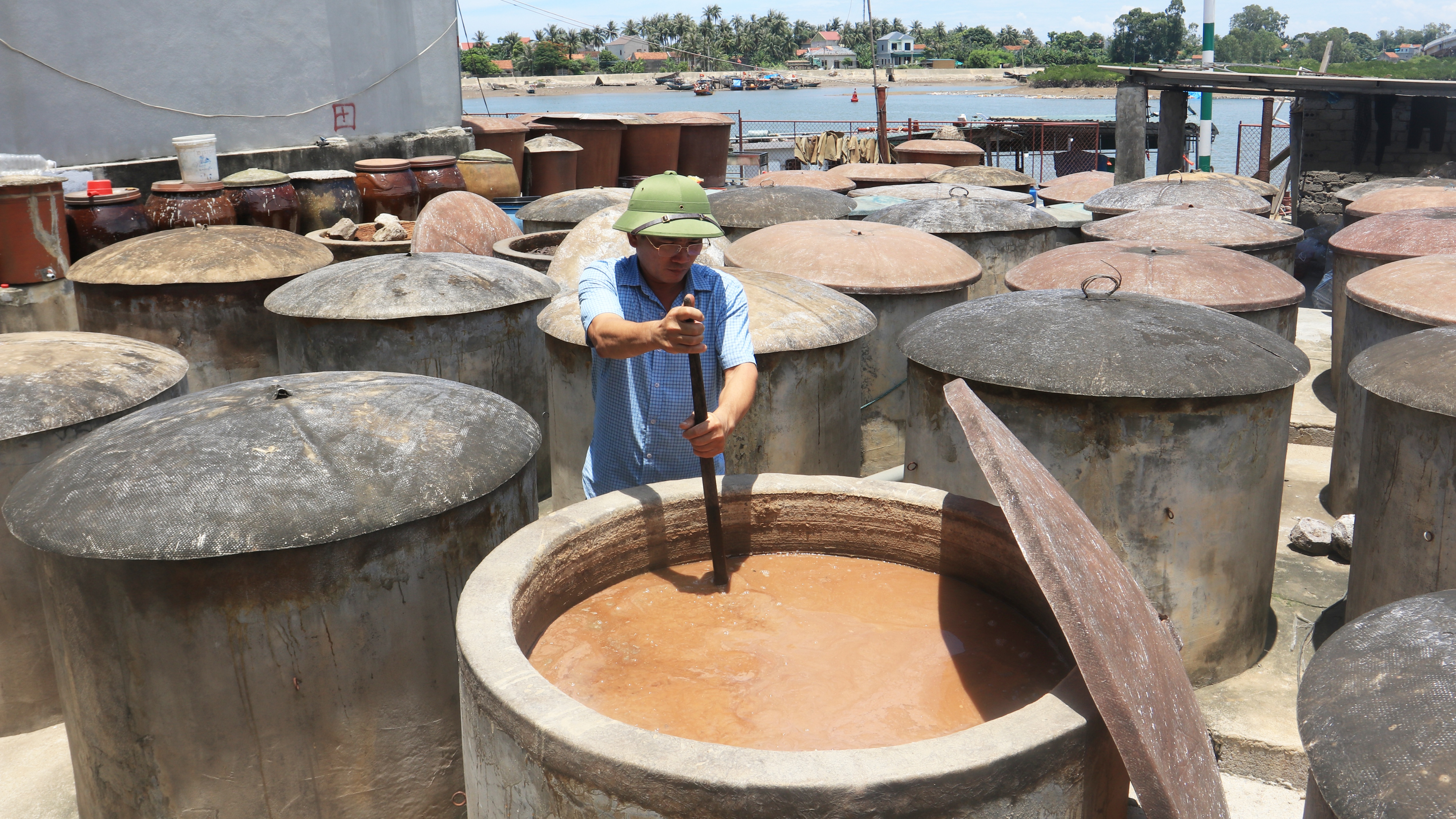 Lớp lớp chum vại chen kín sân, xếp đầy dọc hai bên cổng. Nhà ai cũng vậy. Màu gan gà từ chum sành, rồi da sần, da lươn nối nhau. Ngay sát bên kia đường là chiếc thuyền đang gác mũi, khiến người ta có cảm giác con cá cơm… có chân, làm một bước nhảy từ khoang vô chum vại, để rồi gần 1 năm, nó… thoát xác, khiến ai nấy không giữ được trầm trồ, khen ngợi.
