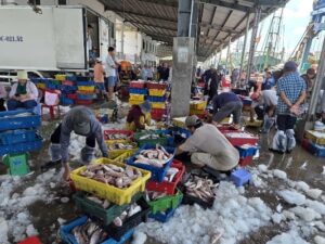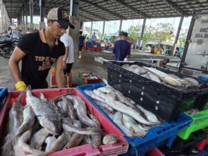Cảnh mua bán hải sản ở cảng cá Sông Đốc