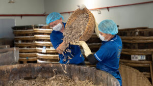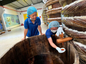 Ở khu nhà máy hơn 12.000 m², hàng trăm thùng gỗ Bời Lời, được những người thợ lành nghề kỳ công đóng, xếp đều tăm tắp. Cá cơm than tươi được ướp muối ngay trên tàu, sau đó nén gài trong thùng gỗ 18–24 tháng. Những giọt mật từ biển – nước mắm truyền thống màu hổ phách, sóng sánh, đậm đà nhỉ ra từ vòi gỗ là kết tinh của cá – muối – thời gian – nắng gió cùng những con người làng biển.