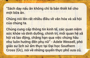 Một người Úc khác, nhà báo Emma Siossian của ABC News, lại ví sách nấu ăn là “snapshot” – bức ảnh chụp tức thời về con người và cội nguồn của chúng ta.