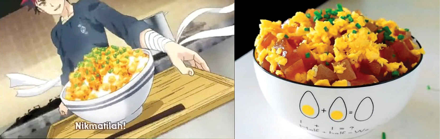 Ngược lại, cũng có những món Nhân làm thành công mà thực tế là “ngon đến không có từ ngữ nào miêu tả hết được”, như ichiraku ramen từ Naruto hay Karaage Roll từ Food Wars.