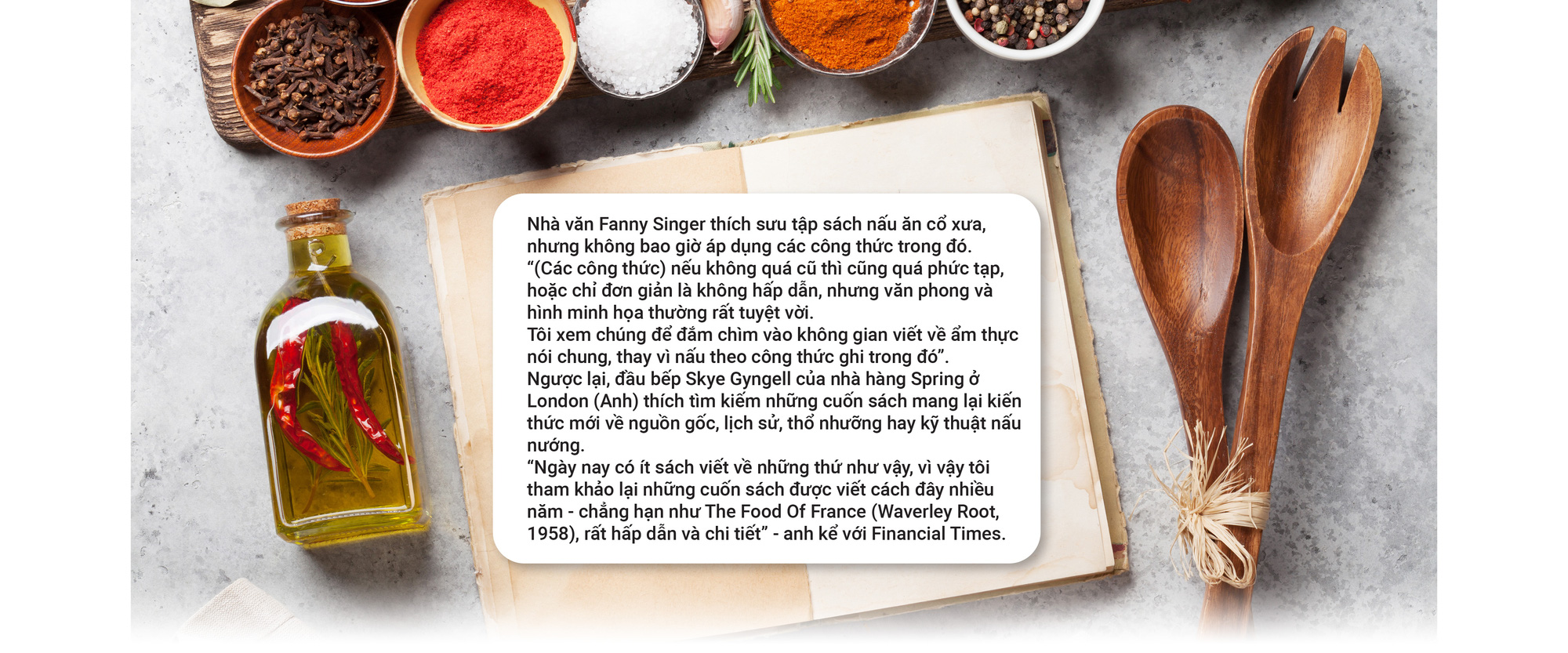 “Tôi mua sách nấu ăn để tìm ý tưởng nấu nướng, để đọc những câu chuyện thú vị và học kỹ thuật bếp núc hơn là để tìm công thức nấu ăn, thứ chỉ cần Google là ra ngay” – cây bút văn hóa Nilanjana Roy viết trên tạp chí Financial Times tháng 5-2023.