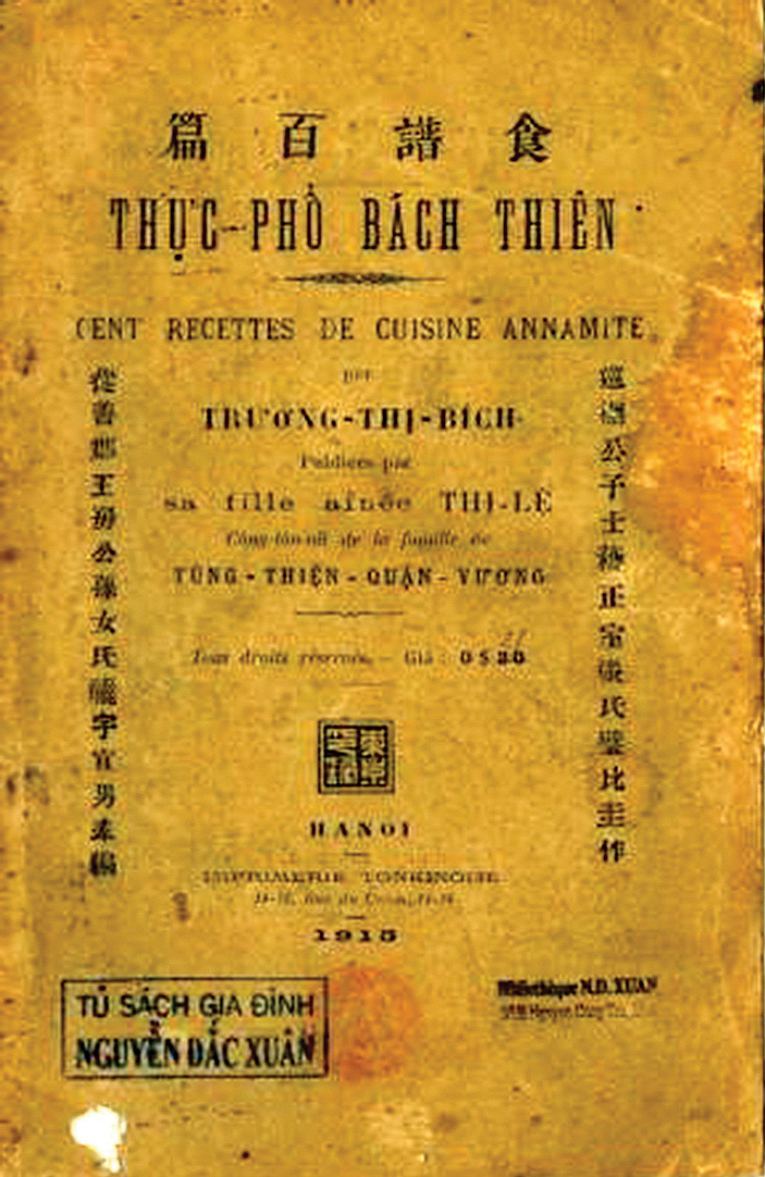 Tiếp theo lần lượt là Sách dạy nấu ăn theo phép An Nam (2) của Bà Lê Hữu Công, Maison J. Viết, Sài Gòn năm 1914 và Thực phổ bách thiên (3) của Trương Thị Bích (bút hiệu Tỷ Quê), gia đình xuất bản, in tại Hà Nội, 1915.