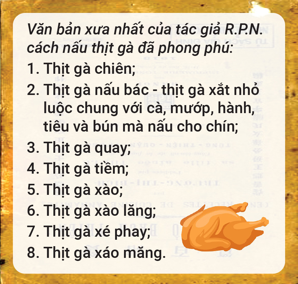 Đầu tiên, xuất hiện sớm nhất có lẽ phải nhắc Sách dạy nấu ăn theo phép Annam (1) của tác giả R.P.N., do Tín Đức thư xã, Sài Gòn xuất bản năm 1909, theo thông tin lưu trên Google Books.