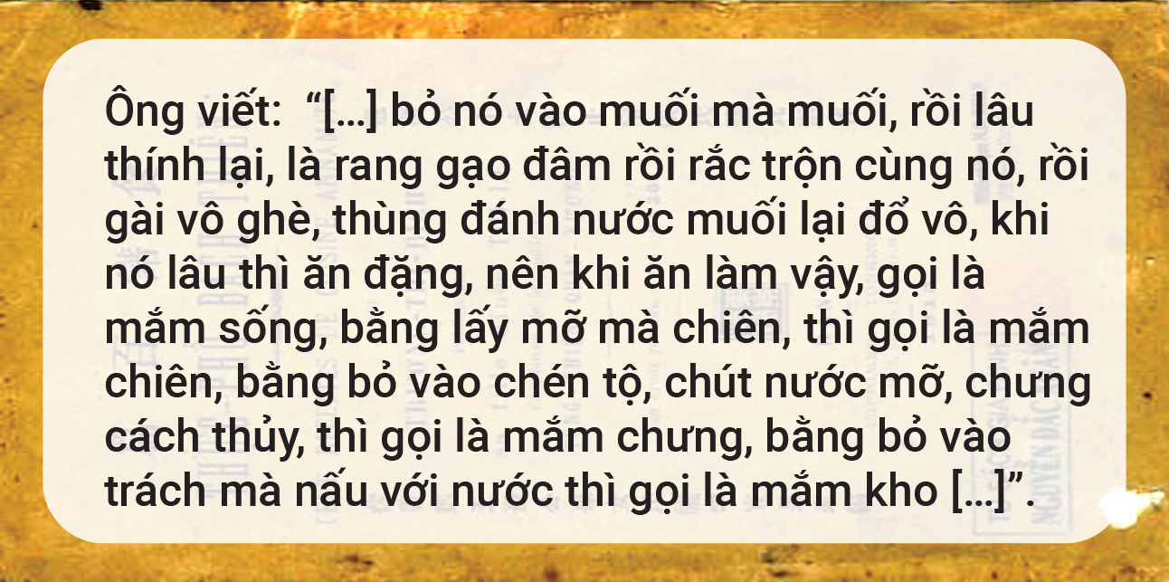 Những món mắm của bà cũng thập phần lạ: “Kho giả rươi”, “Mắm gạch cua”, “Mắm tôm chua” (món không biết miếng tới đâu chớ coi bộ tiếng hơn mắm tôm chua lừng lẫy xứ Gò Công), “Mắm nem”, “Mắm ngừ bộ”,