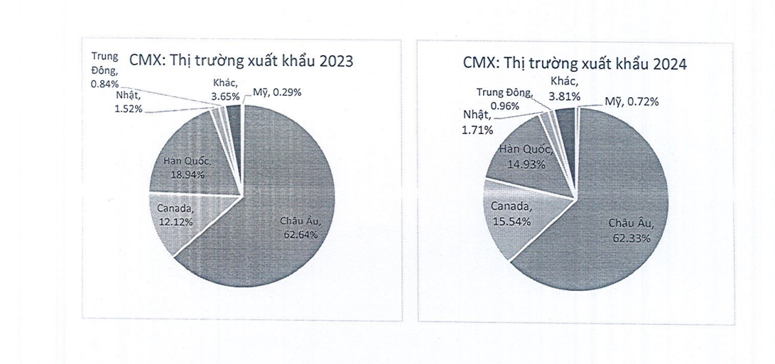 Cụ thể, thị phần xuất khẩu sang Mỹ của Camimex năm 2023 và 2024 chỉ lần lượt đạt 0,29% và 0,72%. Sang đến quý I/2025, Camimex không còn xuất khẩu sang Mỹ.