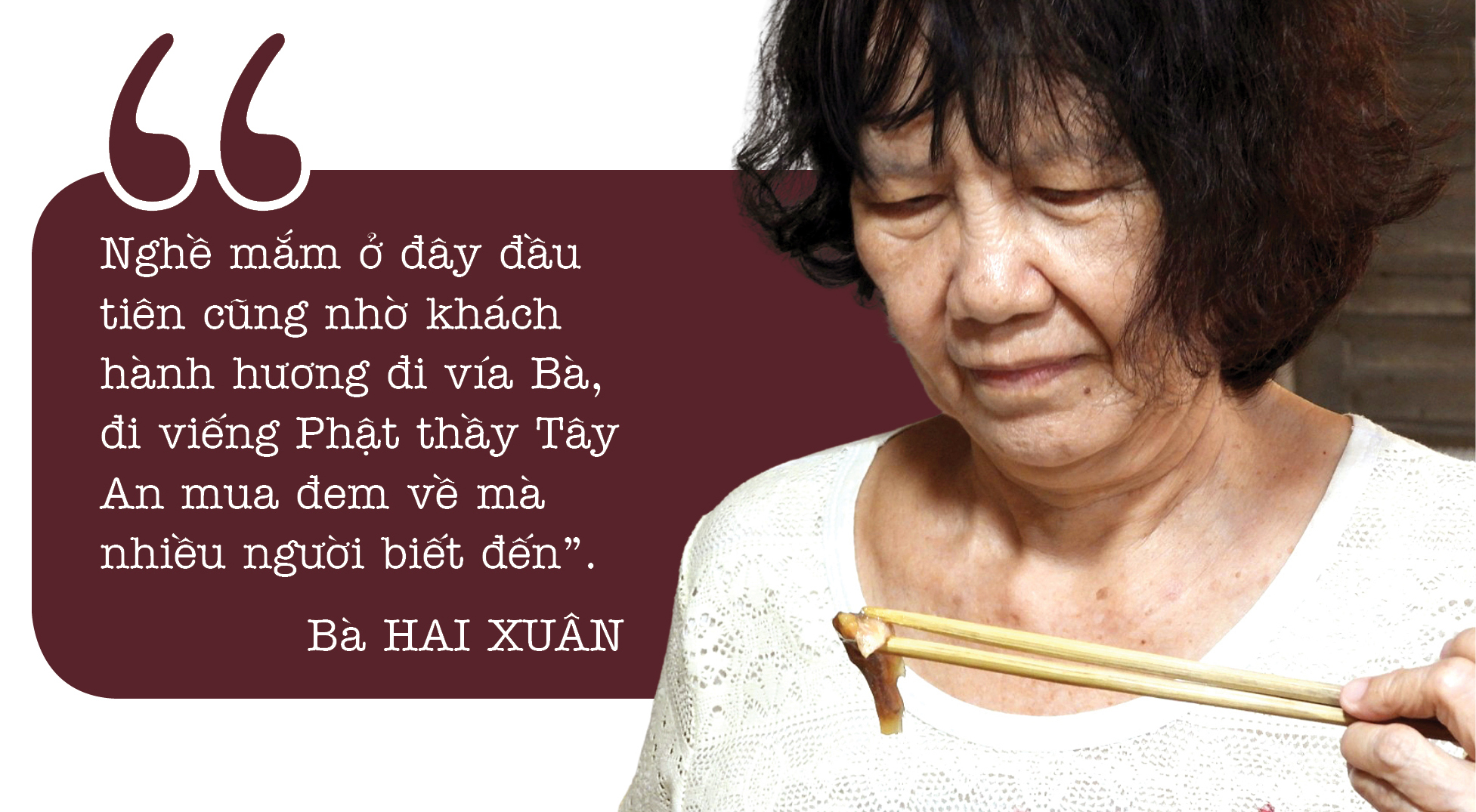 Bà Hai Xuân nói, thời buổi nhà cửa thưa thớt, nhưng người xứ xa cũng lặn lội hỏi mua mắm bà Tư Ấu, bà Giáo Khỏe, bà Giáo Thảo. Đó là những người làm mắm nổi tiếng vùng Châu Đốc. Sau, tên tuổi thành thương hiệu mắm được gần xa biết đến.