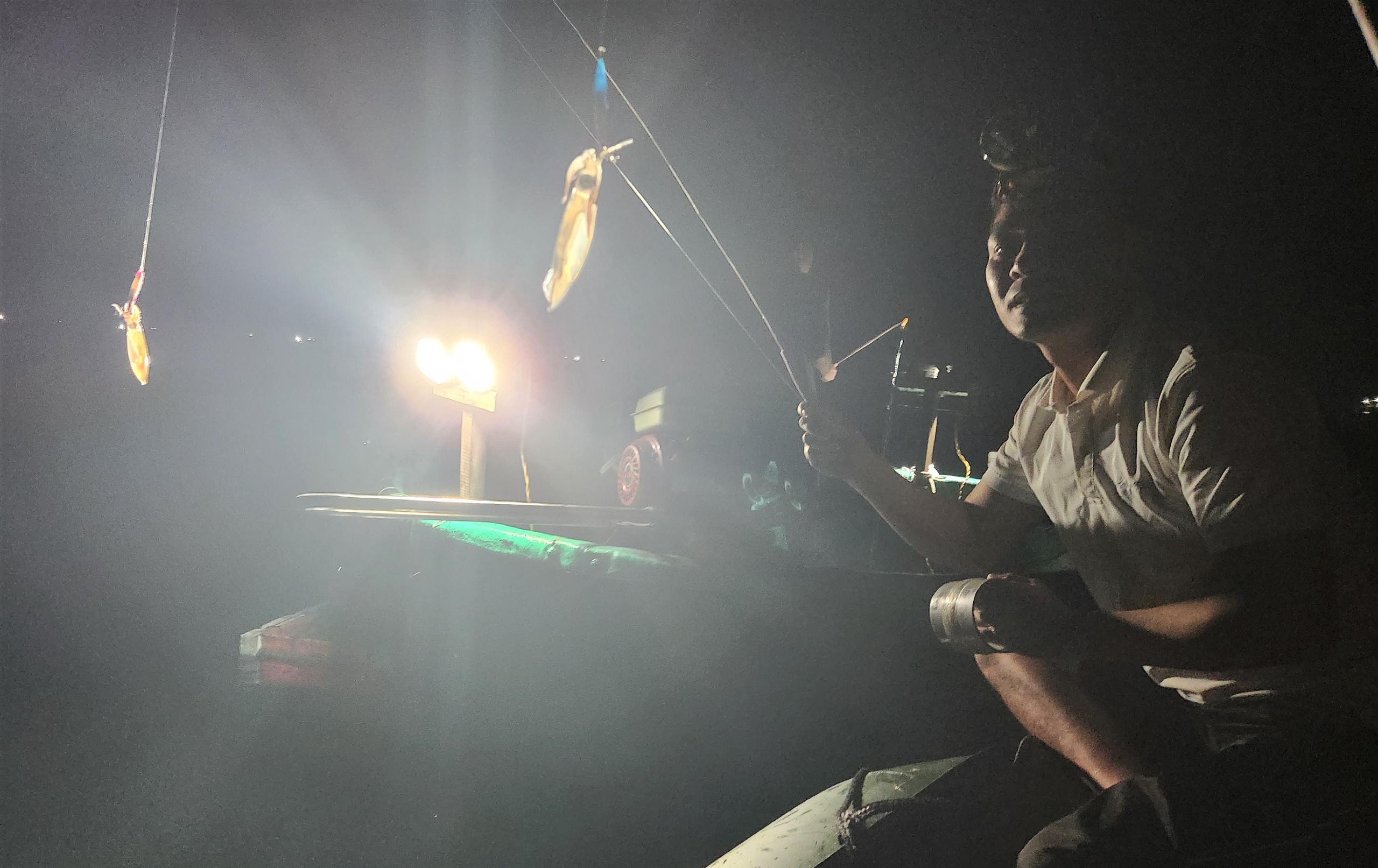 Sau 30 phút rời bờ, anh Thành tắt máy, găm chiếc đèn vào bình ắc quy. Ánh sáng vàng rực tỏa ra, soi rõ một vùng nước xanh ngắt. Đây là “mê hồn trận” để dụ mực. Với chiếc cần câu gắn mồi tôm giả, anh Thành bắt đầu phô diễn kỹ nghệ săn mực với một tay giữ cần, một tay giật liên hồi để tạo sự chuyển động đánh lừa con mồi.