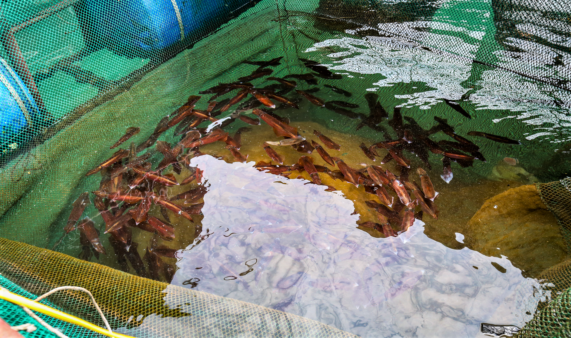 Mực tươi sống được các chủ nhà bè nuôi trong lồng thả dưới biển ẢNH: PHẠM ĐỨC