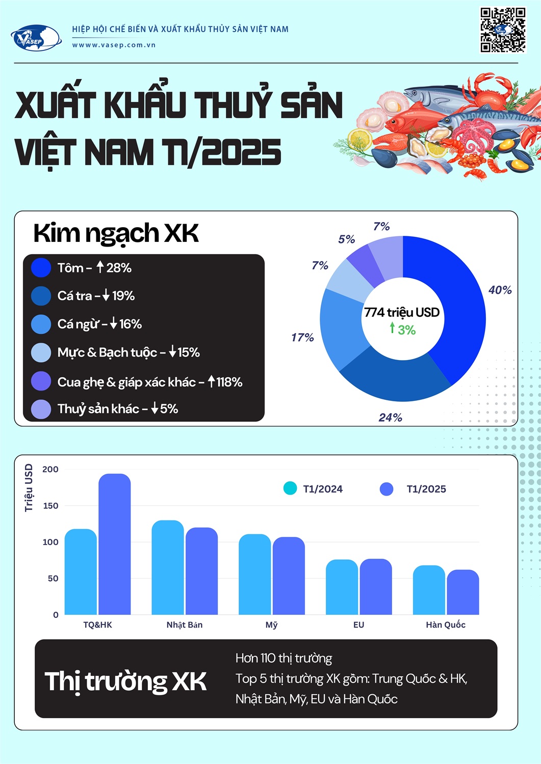 Xuất khẩu thuỷ sản của Việt Nam trong tháng đầu năm 2025 tăng nhẹ 3% so với cùng kỳ, đạt 774 triệu USD. Trong đó, XK một số nhóm mặt hàng đang giảm so với cùng kỳ