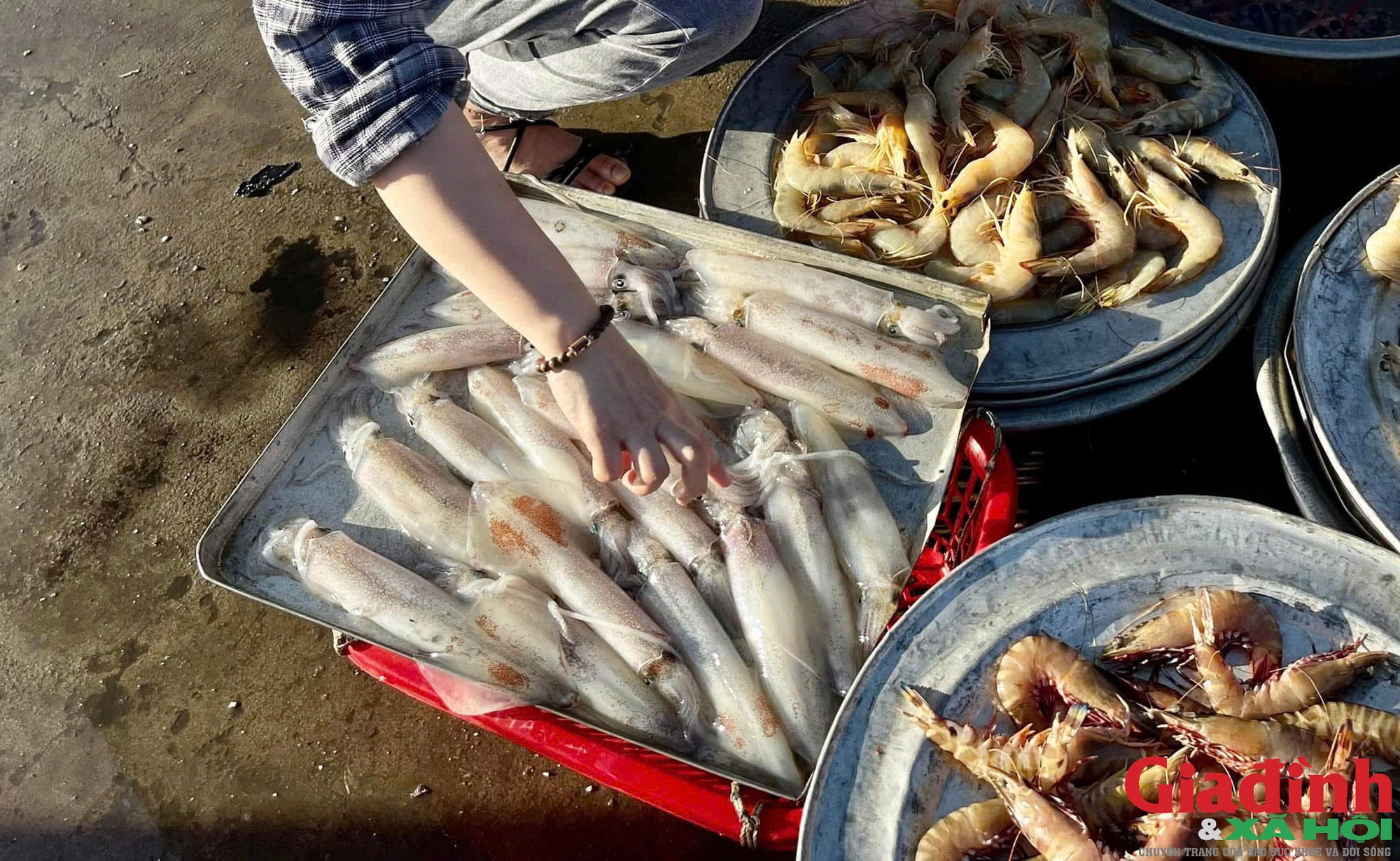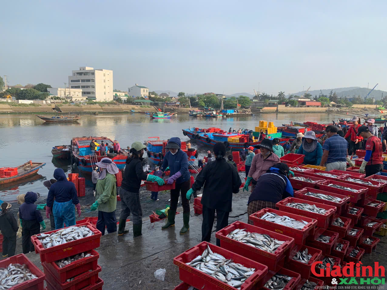Có mặt tại chợ bến cá Nghi Thuỷ từ tờ mờ sáng, khung cảnh mua bán tấp nập với những chuyến cá mới cập bờ. Bên cạnh những mẻ cá thu nổi tiếng, còn có cá trích, cá mai tươi roi rói sáng loáng dưới nắng.