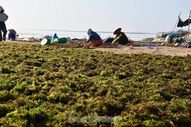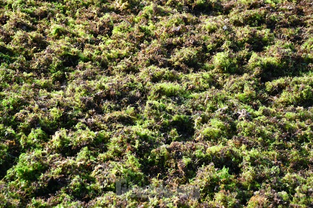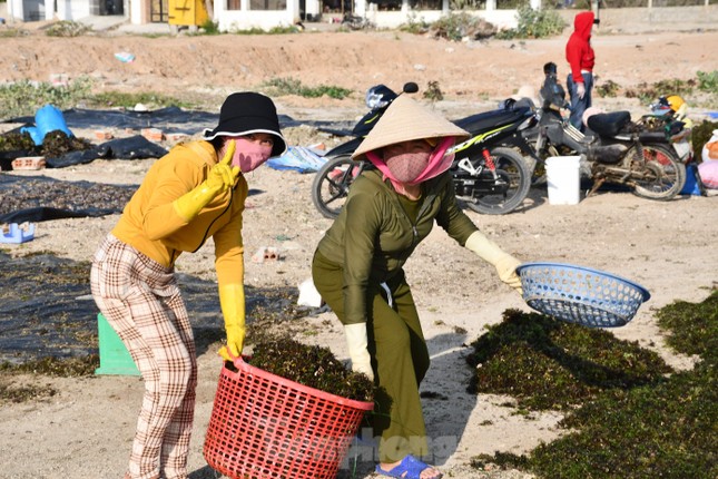 Thời tiết càng nắng gắt thì việc thu hoạch càng thuận lợi hơn. Rau câu khi khô được tập hợp để đóng bao chờ thương lái đến thu mua.