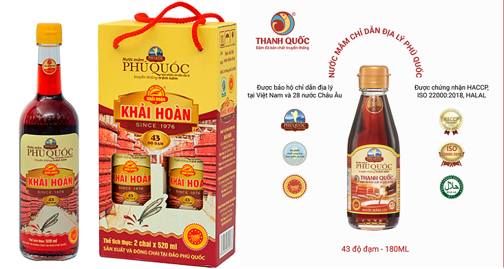 – Sản phẩm “Nước mắm Phú Quốc Khải Hoàn 38 độ đạm”, “Nước mắm Phú Quốc Khải Hoàn 40 độ đạm”, “Nước mắm Phú Quốc Khải Hoàn 43 độ đạm”của Công ty CP thương mại Khải Hoàn, thị trấn Dương Đông, huyện Phú Quốc, Kiên Giang.