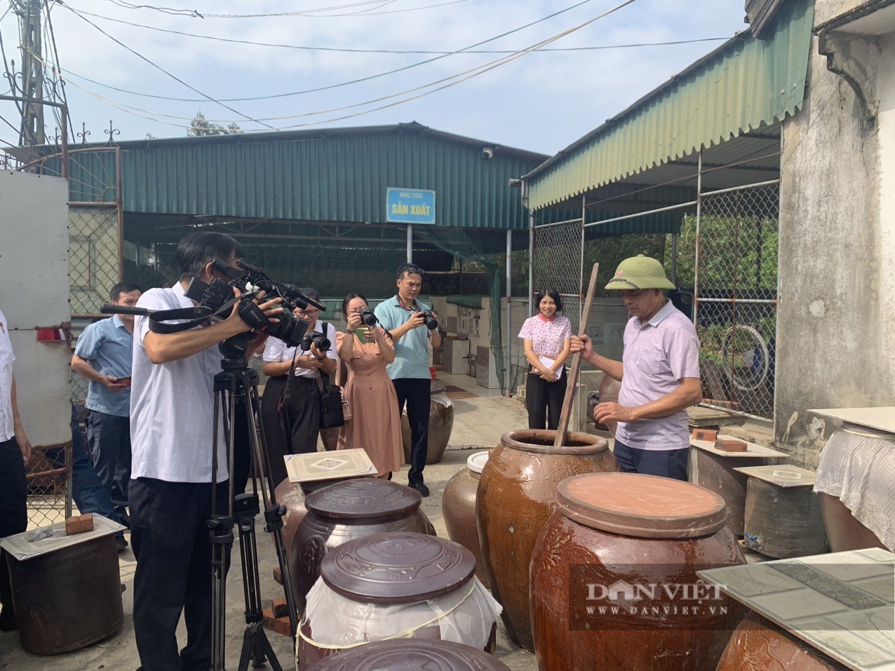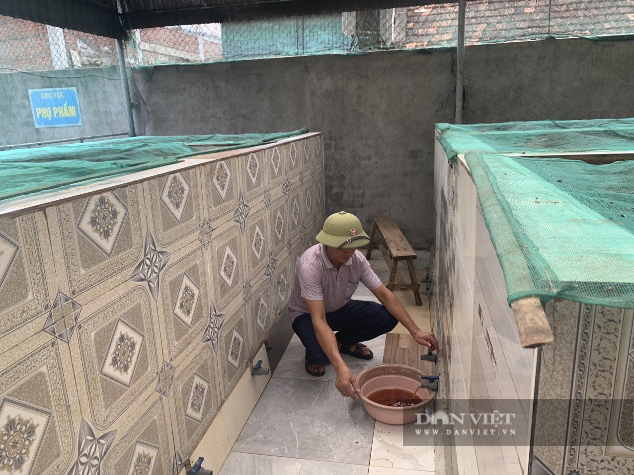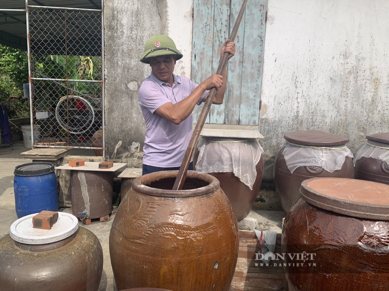 Xưởng sản xuất nước mắm nằm khiêm tốn trong vườn nhà. 8 bể ướp được đầu tư quy mô và hàng chục chum sành sứ vừa vào vụ ướp được nửa năm. Khi ông Hùng chắt nước mắm ra đã rất đậm đặc, màu cánh gián sánh như giọt mật.