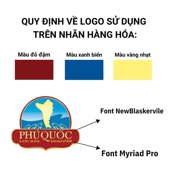 – Thứ nhất là quy định về logo sử dụng trên nhãn hàng hóa: Bắt buộc logo chung Phú Quốc gồm ba màu chủ đạo: Màu đỏ đậm, màu xanh biển và màu vàng nhạt (như màu minh họa); kiểu chữ PHÚ QUỐC của logo là kiểu chữ NewBlaskervile, màu vàng; kiểu chữ nước mắm – extract of fish là kiểu chữ Myriad Pro, nghiêng, màu vàng.