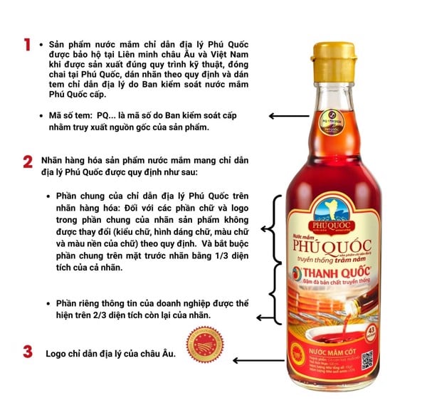 – Sản phẩm nước mắm chỉ dẫn địa lý Phú Quốc được bảo hộ tại Liên minh châu Âu và Việt Nam khi được sản xuất đúng quy trình kỹ thuật, đóng chai tại Phú Quốc, dán nhãn theo quy định và dán tem chỉ dẫn địa lý do Ban kiểm soát nước mắm Phú Quốc cấp. Mã số tem: PQ… là mã số do Ban kiểm soát cấp nhằm truy xuất nguồn gốc của sản phẩm.