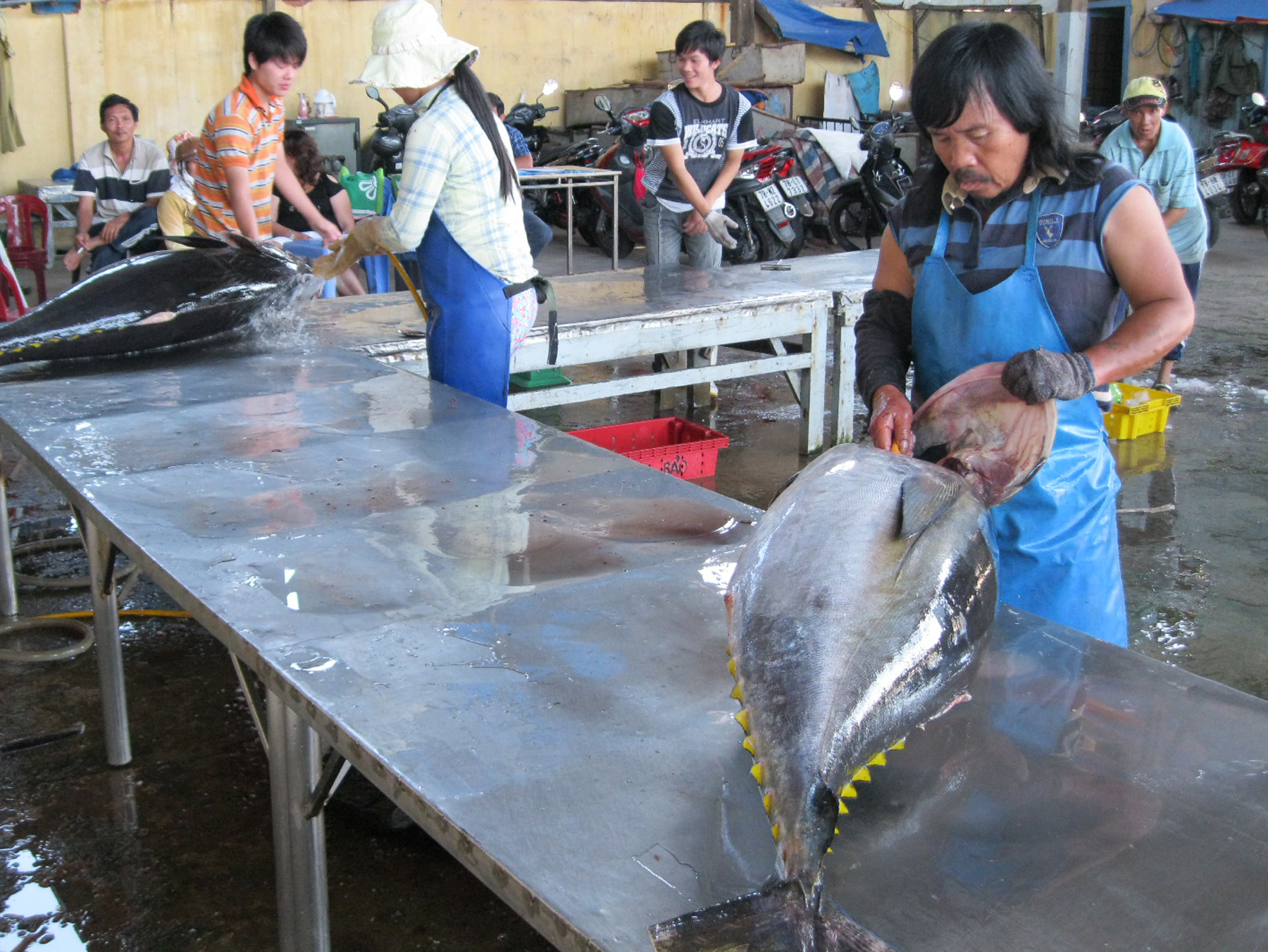 Ngư dân Phú Yên sơ chế cá ngừ đánh bắt được để đưa đi tiêu thụ (Ảnh: Thủy Tiên).