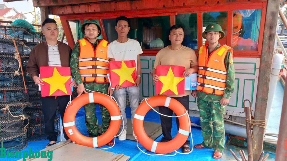 Cán bộ Đồn Biên phòng Nhật Lệ tặng cờ Tổ quốc cho ngư dân. Ảnh: Đức Tú