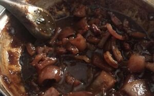 Cay dữ dội. Cá bò kho với ba chỉ là món ngon thường thấy. Thịt ba chỉ xắt nhỏ không cần tao, kho chung với ít lát cá, gia vị, màu kho, hành củ, tiêu, ớt, nước lạnh và nửa trái thơm xắt mỏng. Kho lửa thiệt nhỏ để mỡ và thơm ra nước, thấm vô miếng cá nâu đen, béo núc ních.