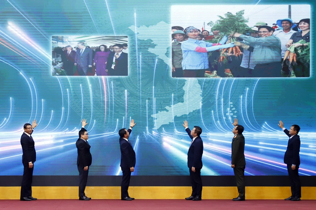 Bộ trưởng Trần Đức Thắng, Tổng Giám đốc VTV Nguyễn Thanh Lâm cùng các đại biểu tiến hành nghi thức ra mắt hệ thống truy xuất nguồn gốc nông sản Việt Nam (Ảnh: Khương Trung).
