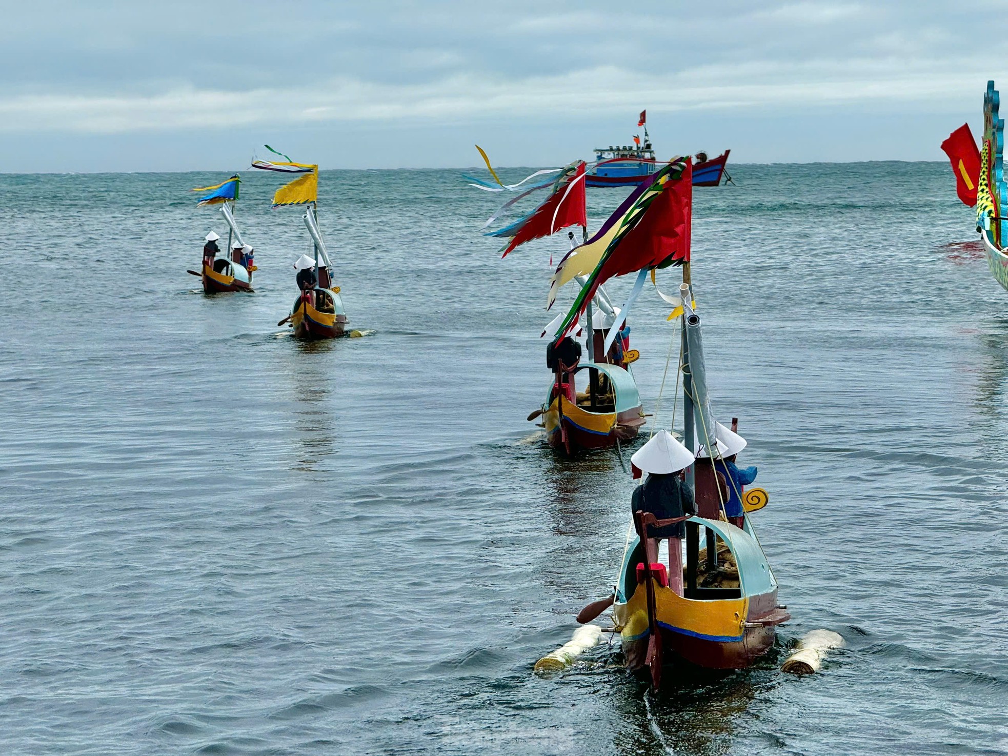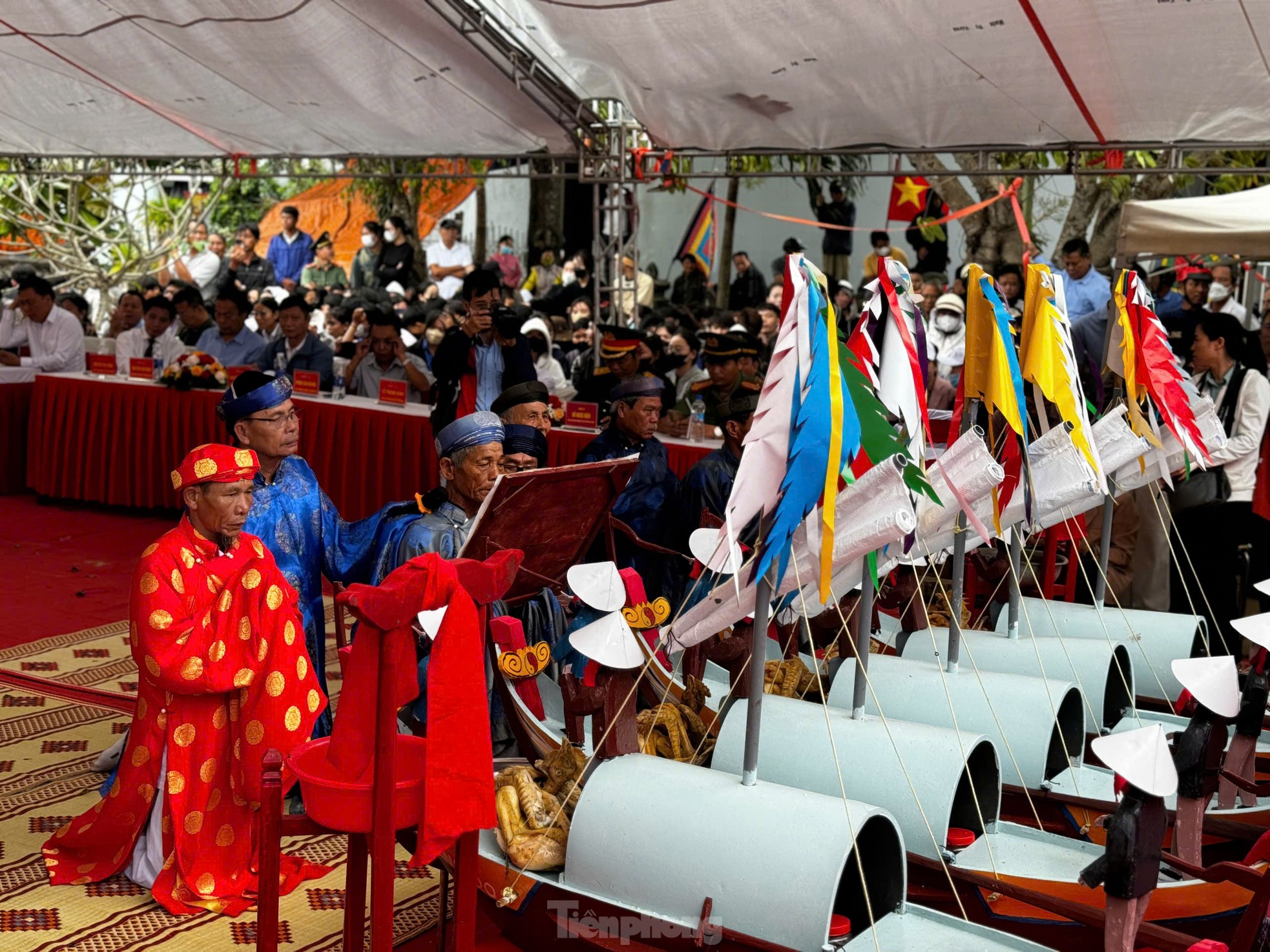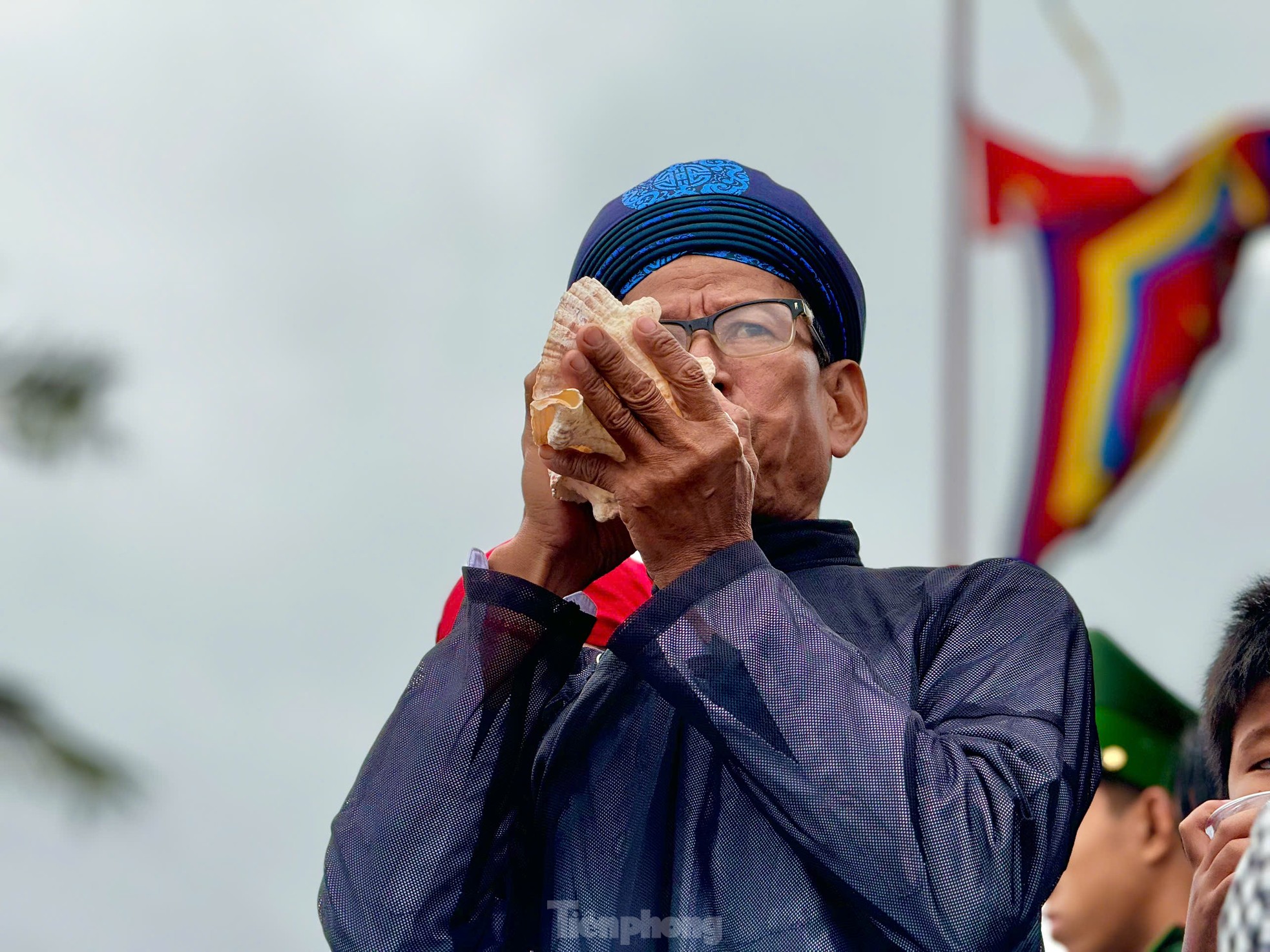 Kết thúc phần tế lễ, tiếng ốc u được thổi lên từng hồi trầm hùng, hiệu lệnh trai tráng trong làng rước mô hình 5 thuyền câu ra biển. Tái hiện lại lễ tiễn đưa các hùng binh Hoàng Sa kiêm quản Bắc Hải năm xưa lên đường làm nhiệm vụ thiêng liêng với Tổ quốc. Ảnh: Nguyễn Ngọc.